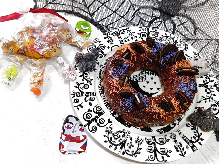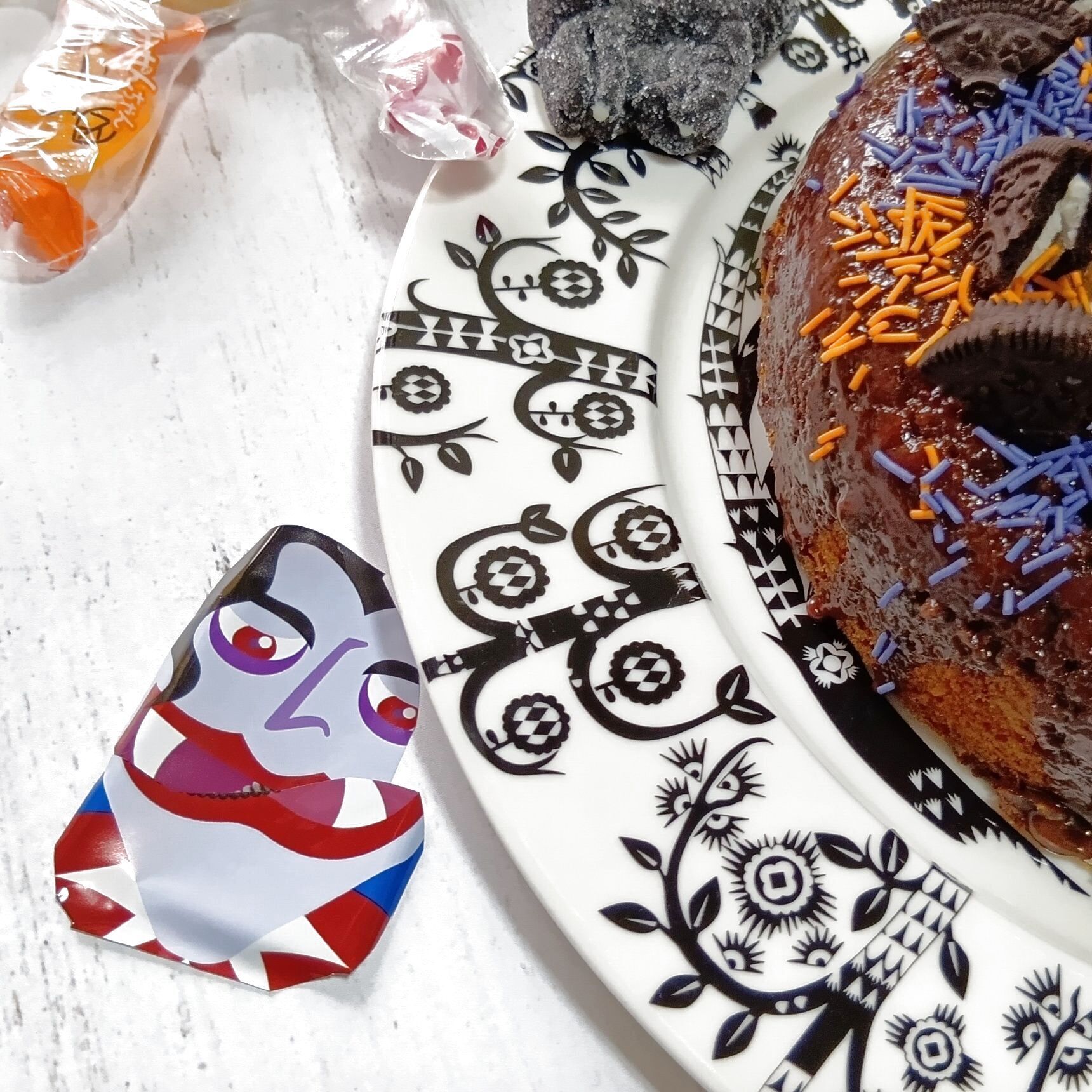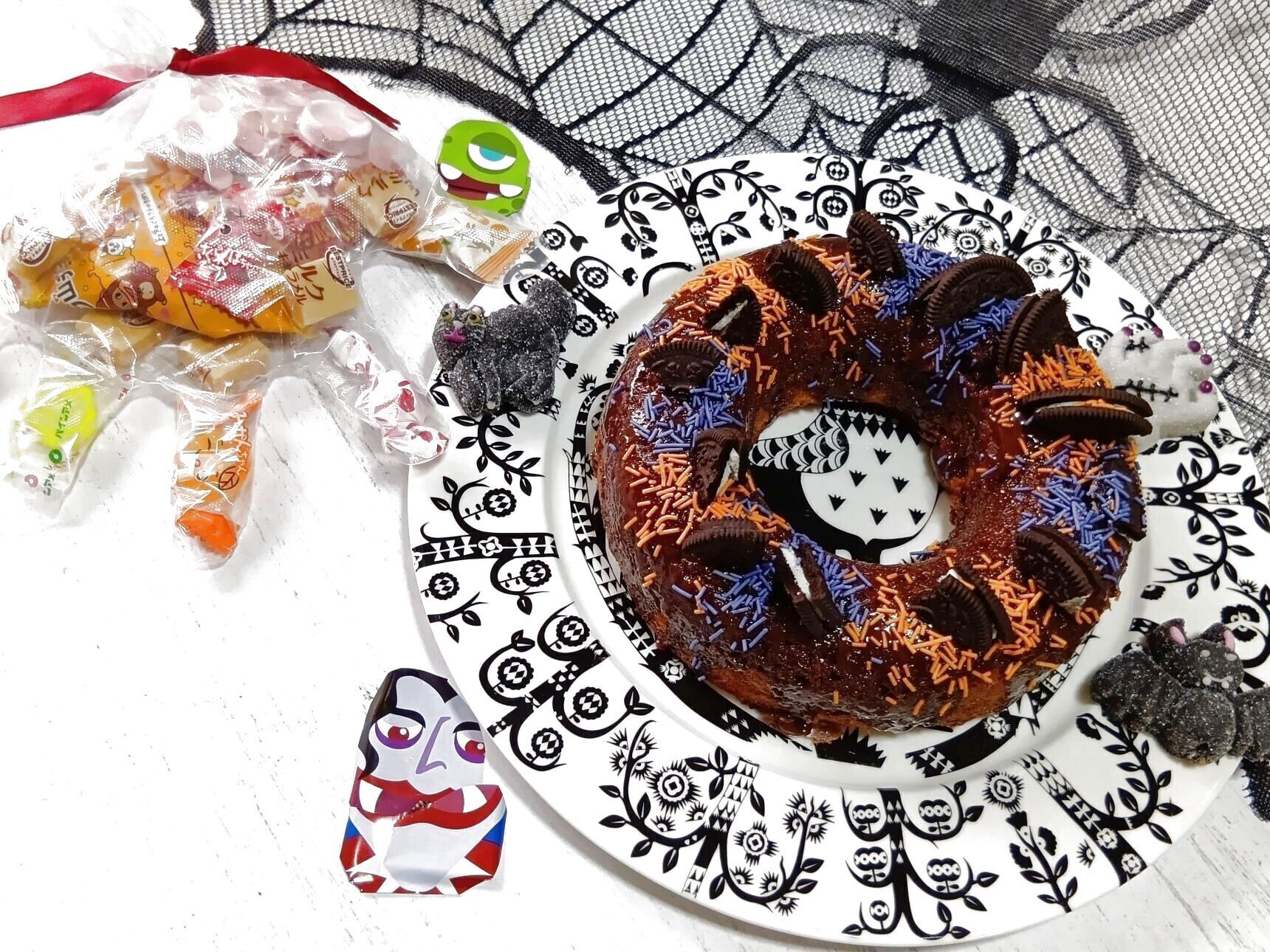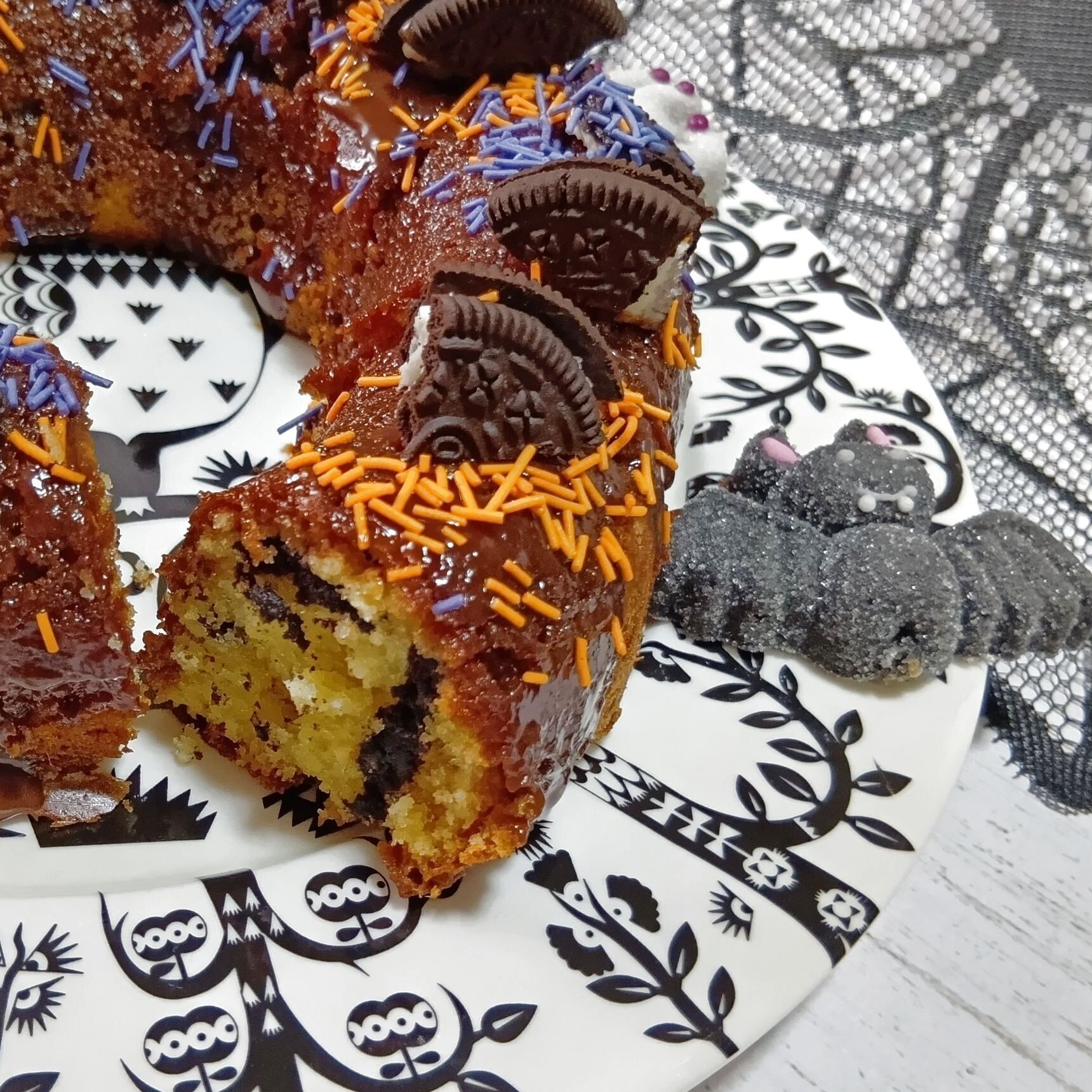 切り分けると、このような感じです。オレオ入りなので、お色もブラックでハロウィンらしいですし、お味もオレオのお味でケーキとよく馴染んで美味しいです。