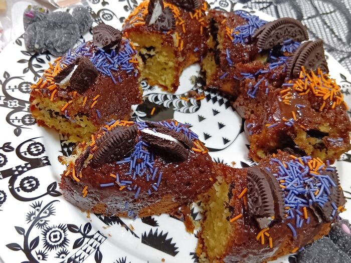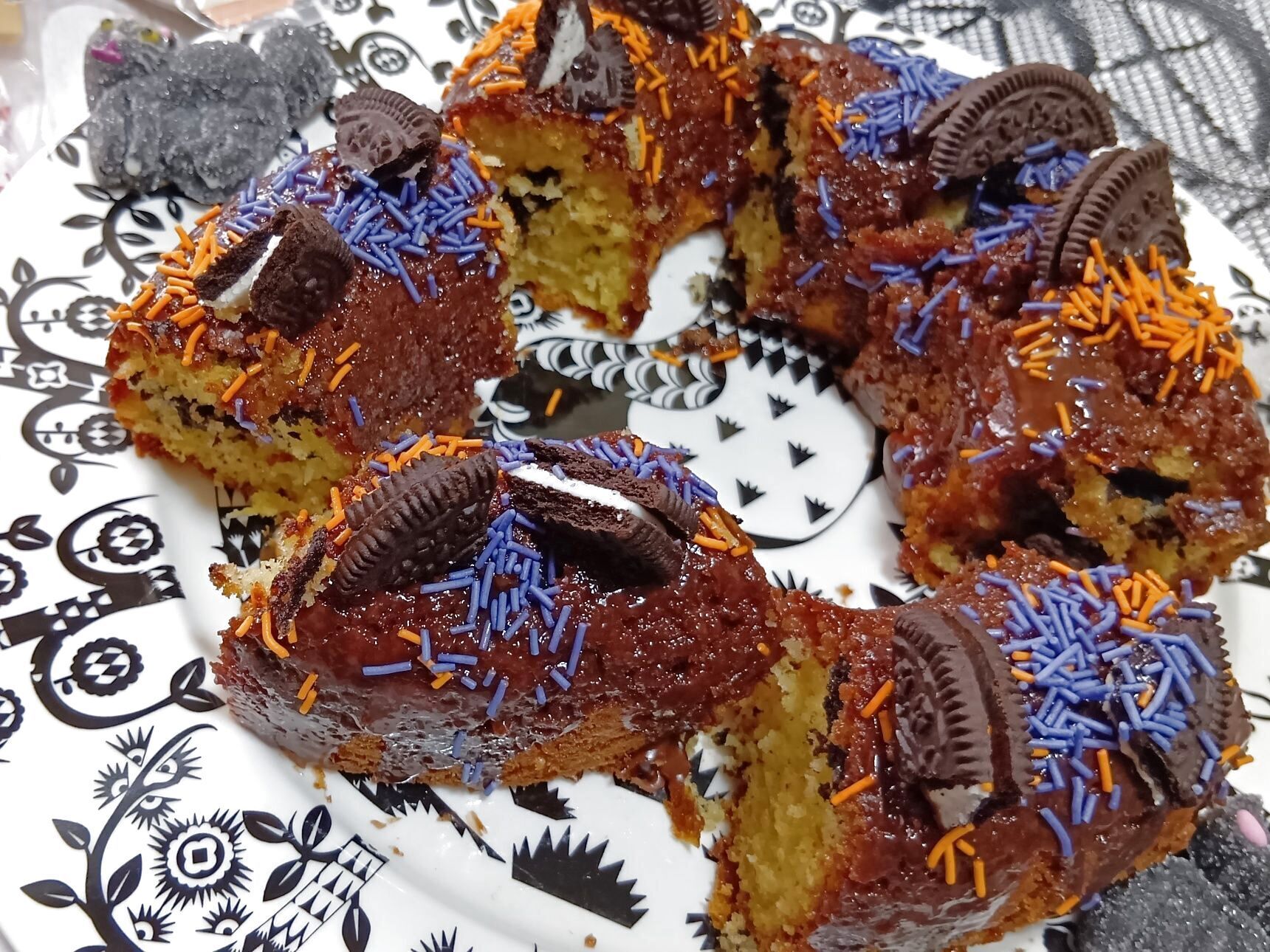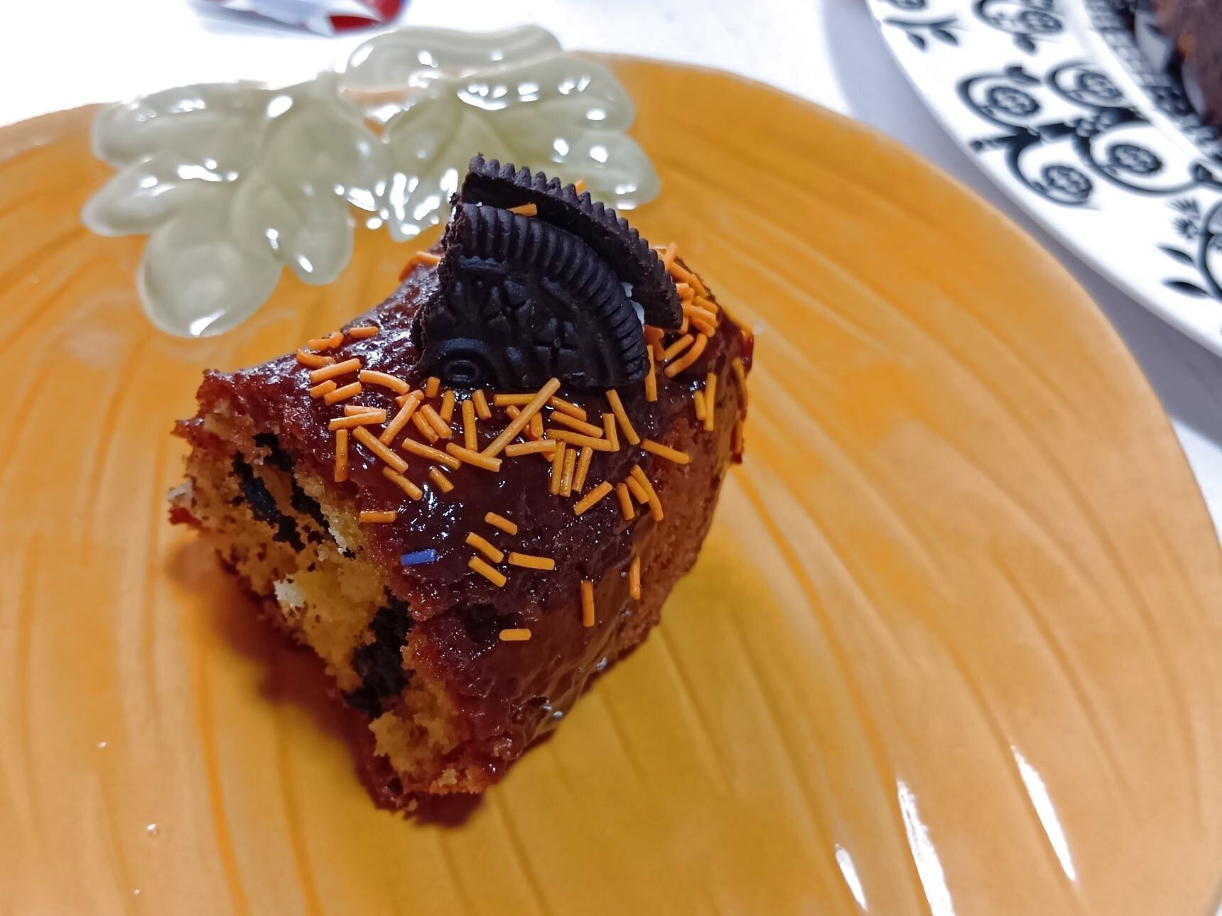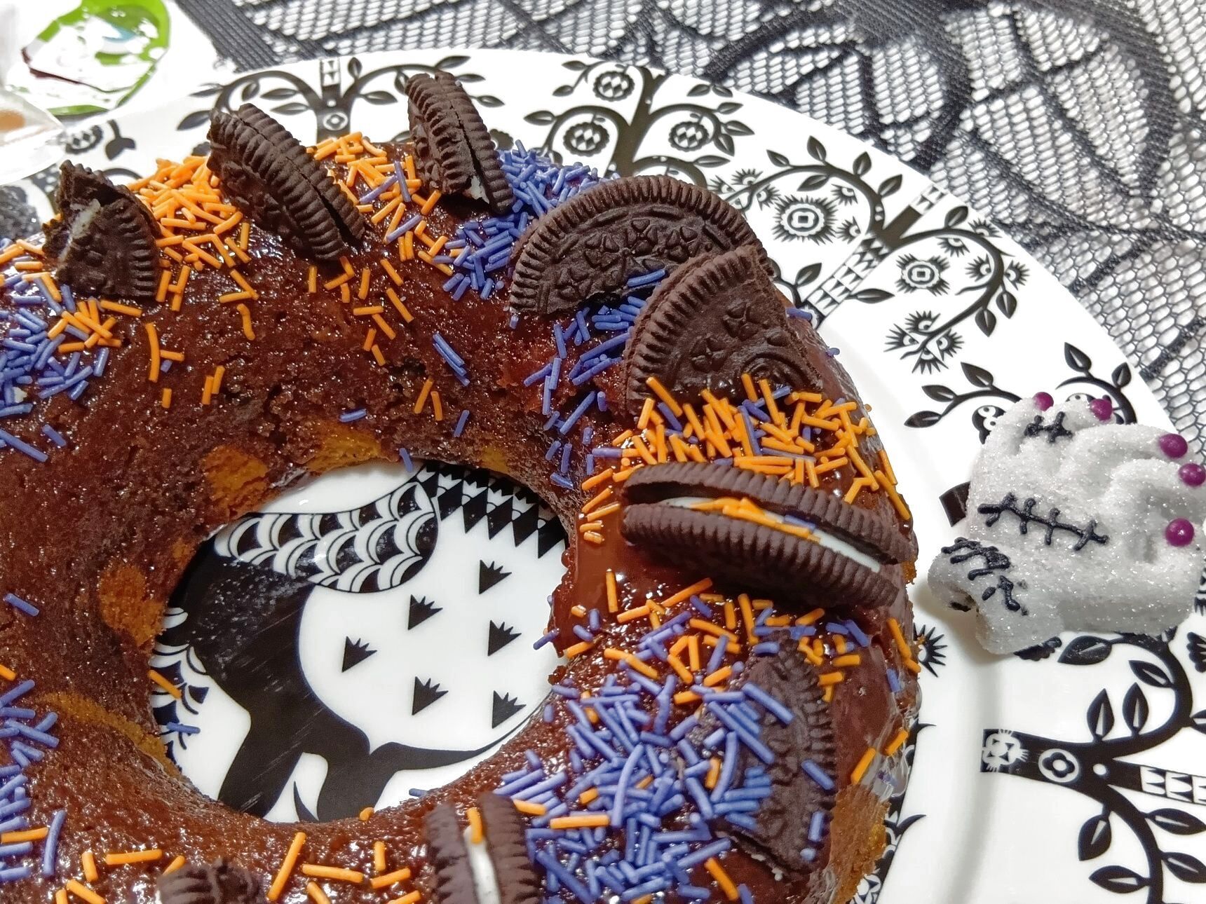 切り分けると、このような感じです。オレオ入りなので、お色もブラックでハロウィンらしいですし、お味もオレオのお味でケーキとよく馴染んで美味しいです。