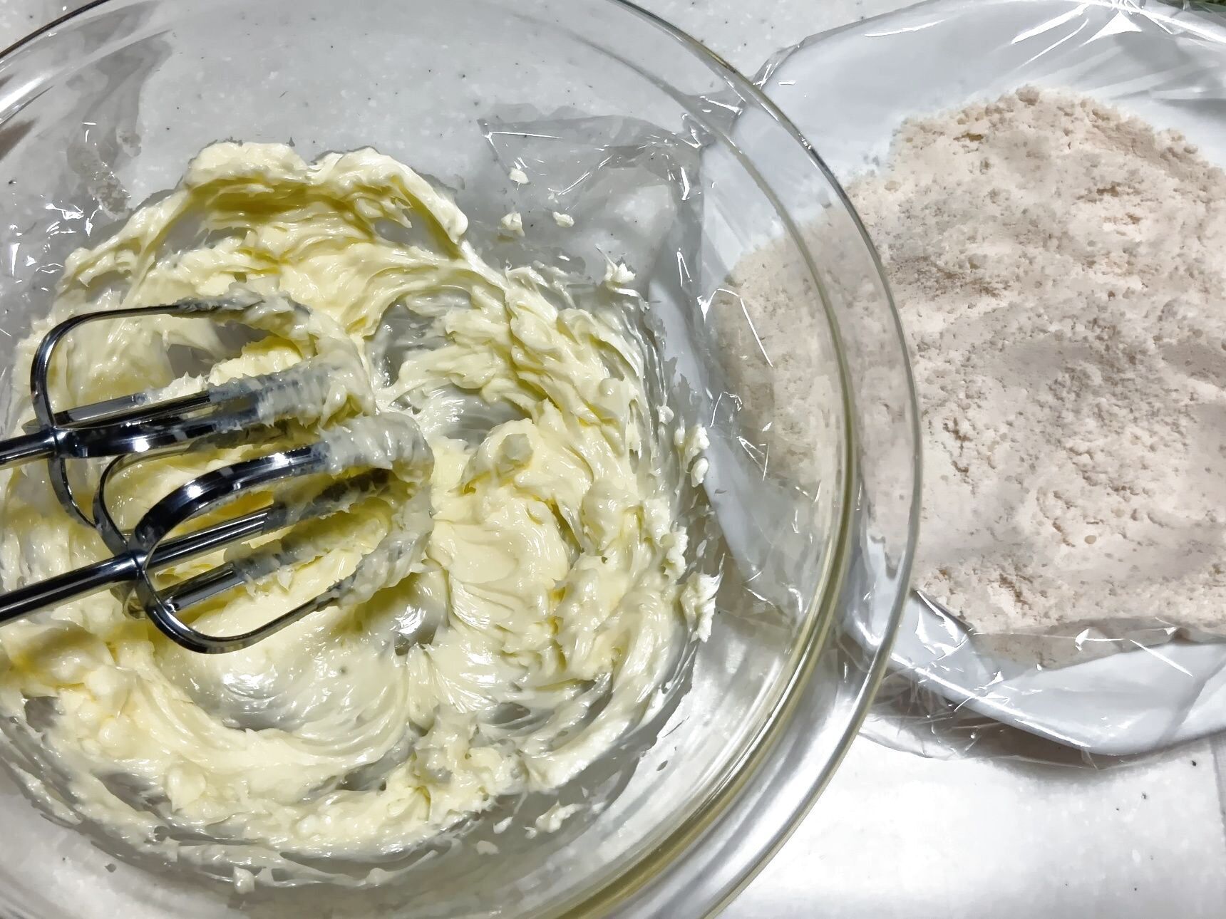 4.ボウルに室温に戻したバターを入れて、ハンドミキサーで混ぜ、てんさい糖を数回に分けて入れ、混ぜ合わせます。