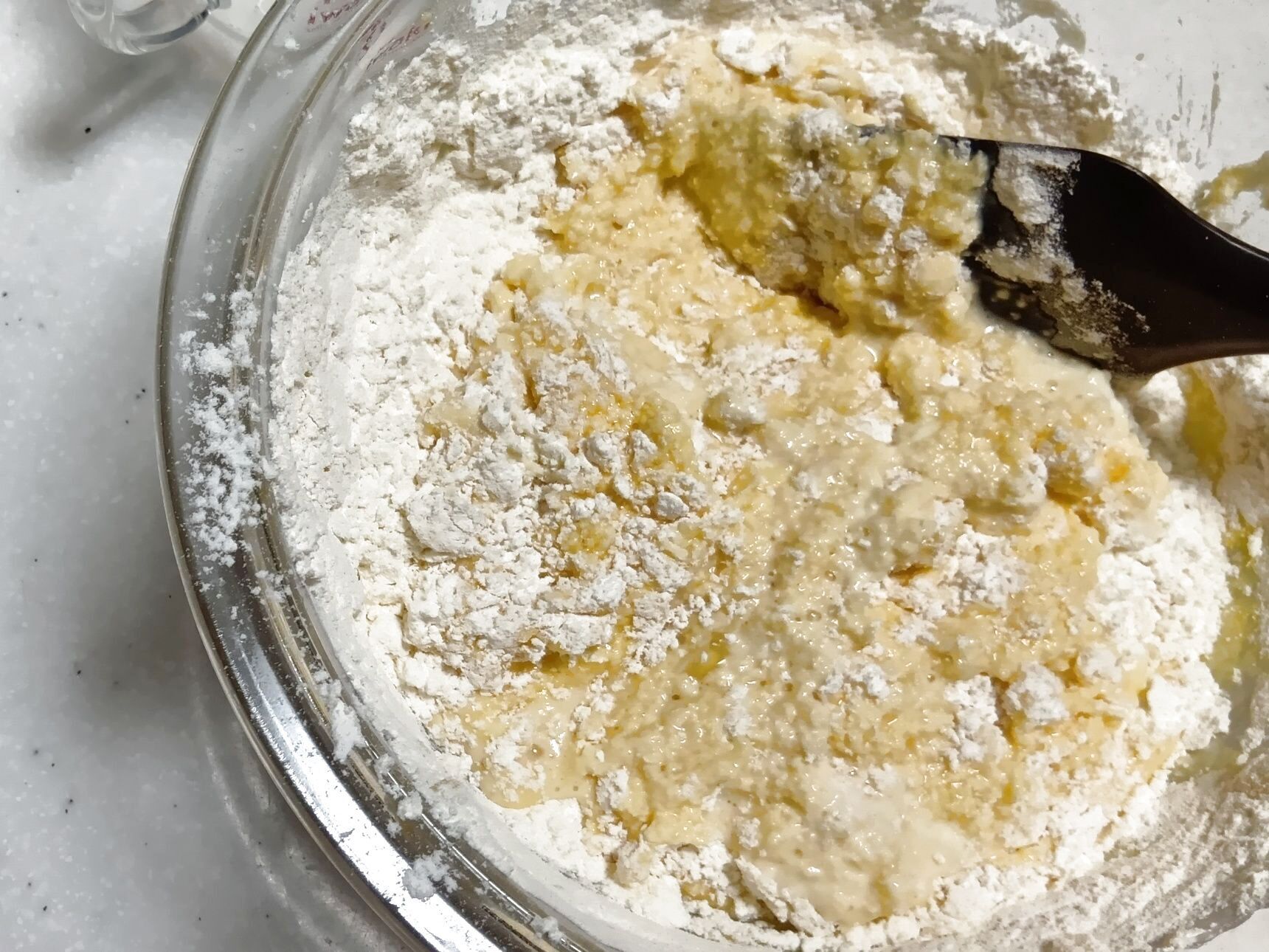 3.薄力粉とベーキングパウダーをふるい入れ、牛乳を加えてゴムべらで混ぜます。