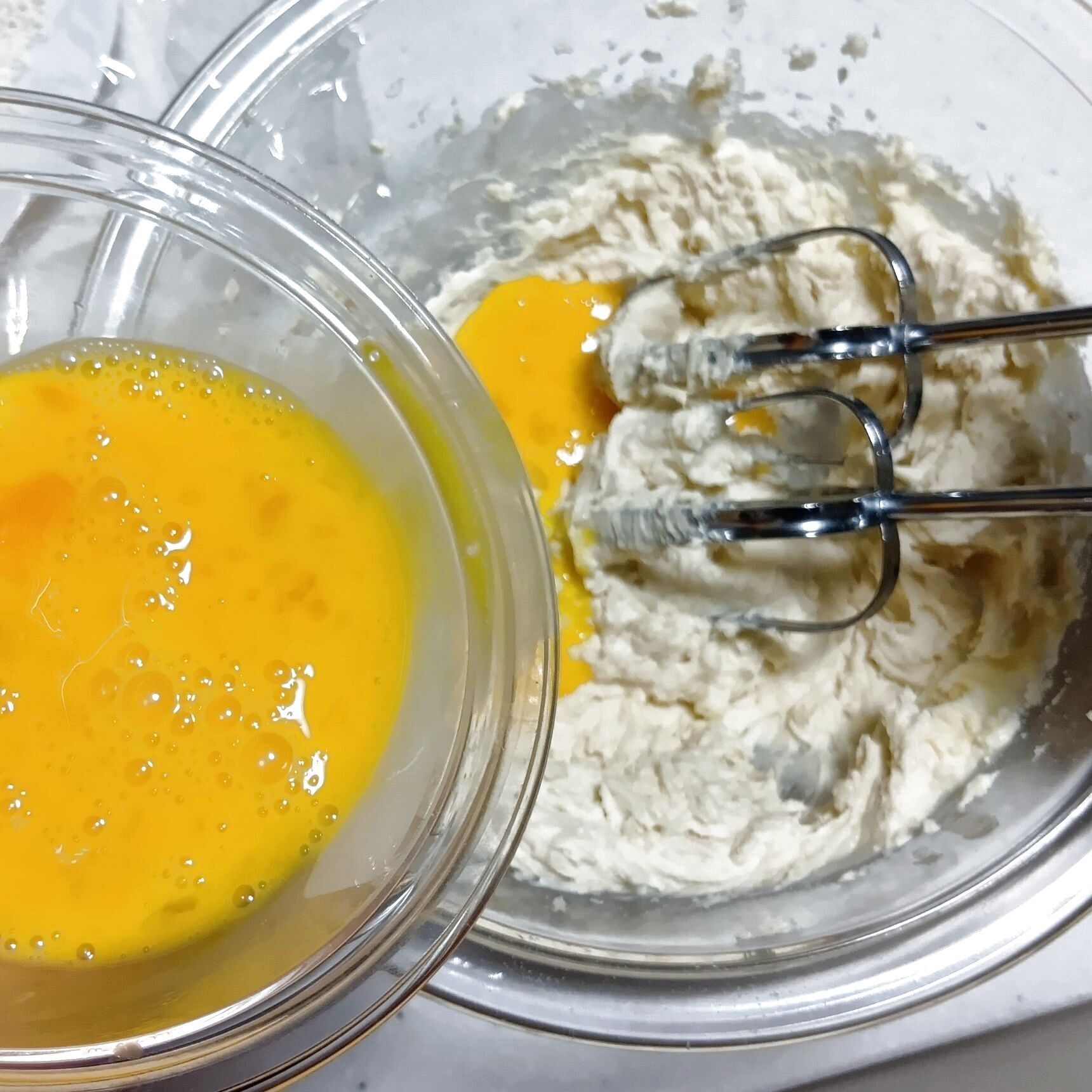 5.割ってほぐした卵を、少量ずつ加え、混ぜ合わせます