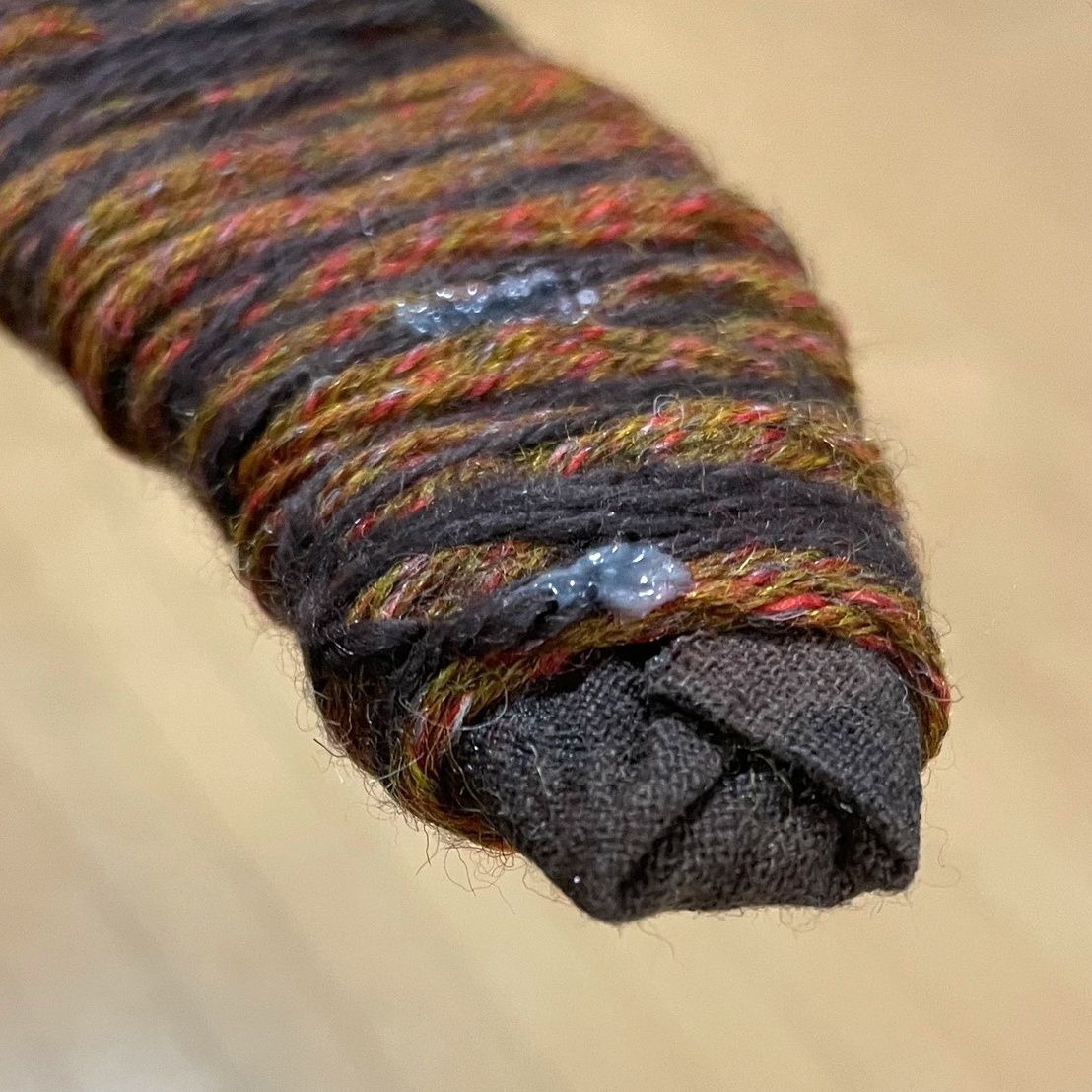 両端の先端部分は巻けないので、気になる場合はあらかじめ茶色い布を貼っておくと目立ちません。