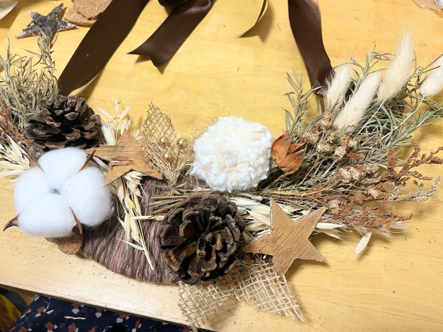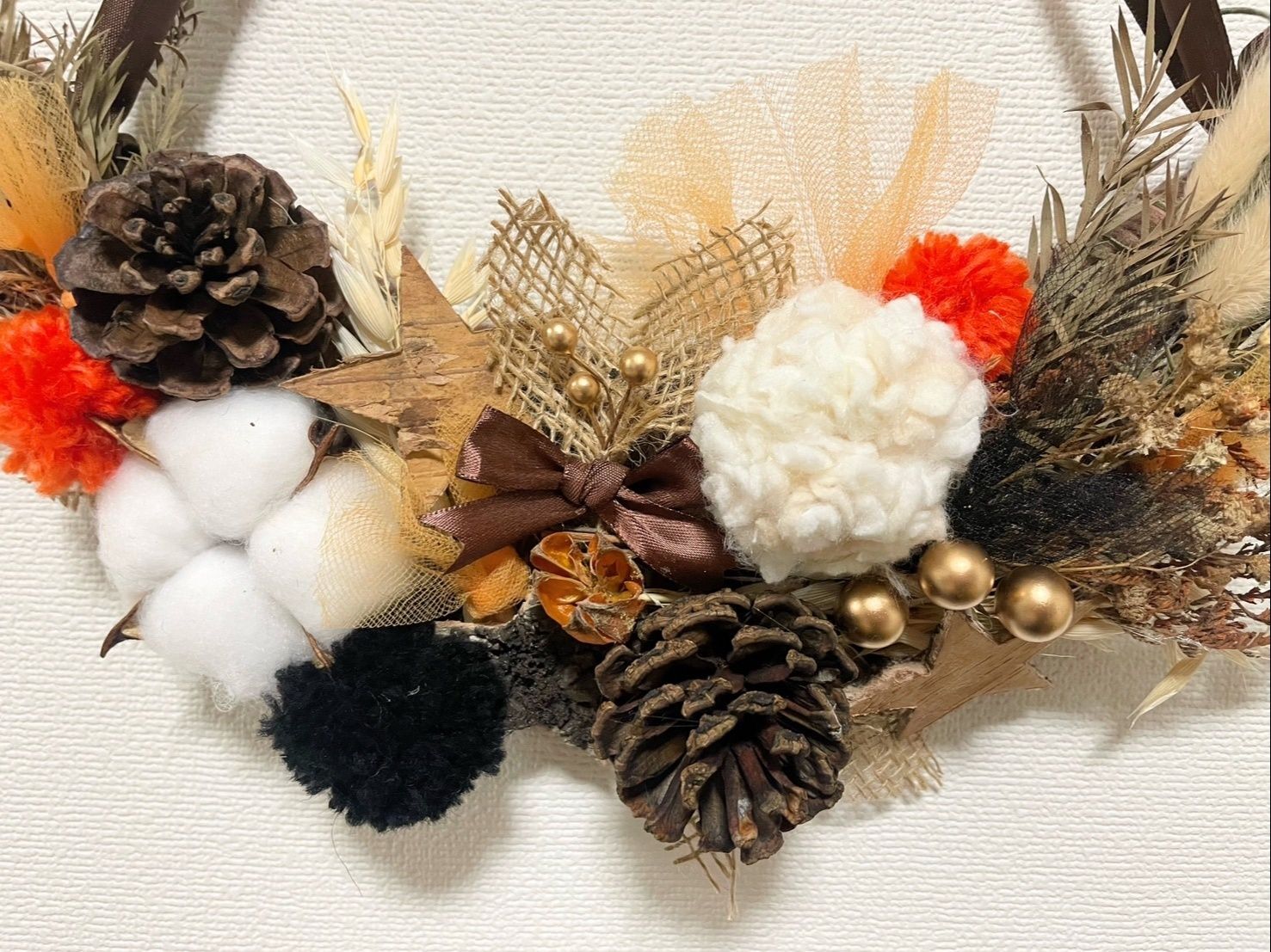 両端に細長いドライを接着してから、木の実や毛糸玉などの大きなパーツを貼り、隙間を埋める形で細かいパーツやリボン、オーガンジーなどを入れると上手くまとまります。