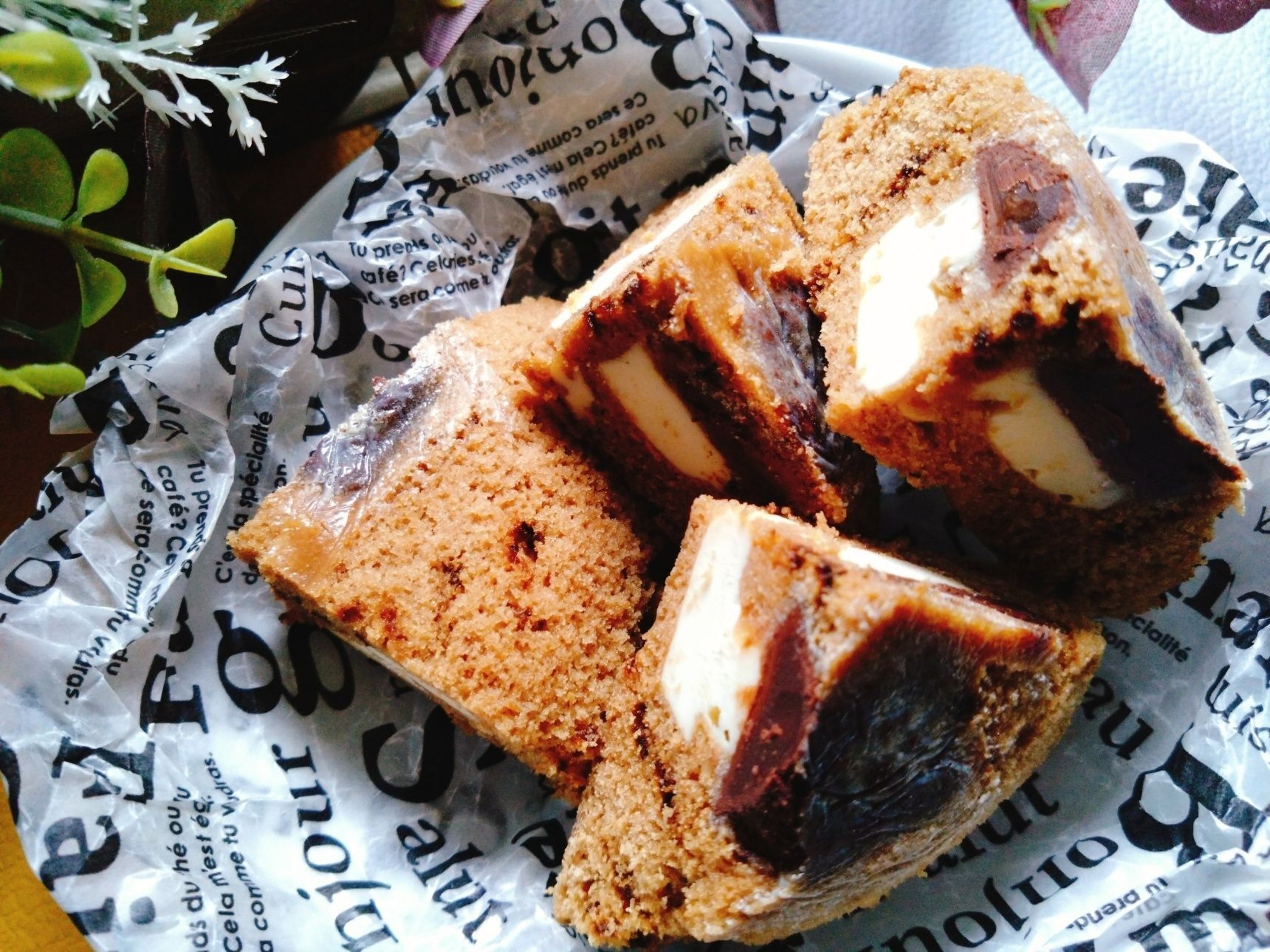 1.ボウルに生地を半量流し入れ、クリームチーズとチョコをのせて残りの生地を入れる。
