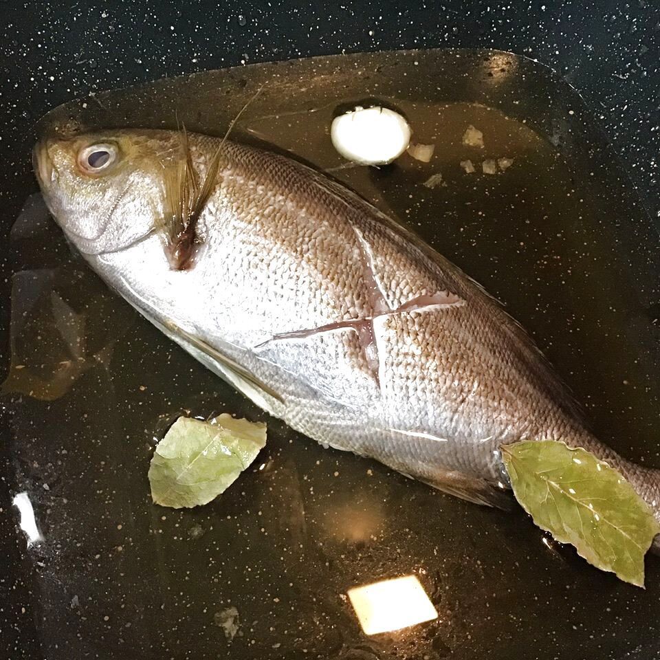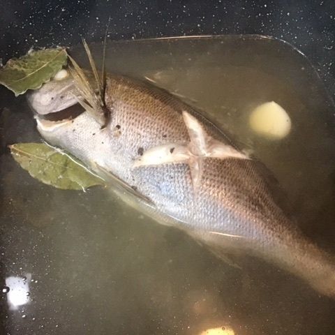 鍋に白ワインを入れて魚を入れ、ひたひたの水を注ぐ。