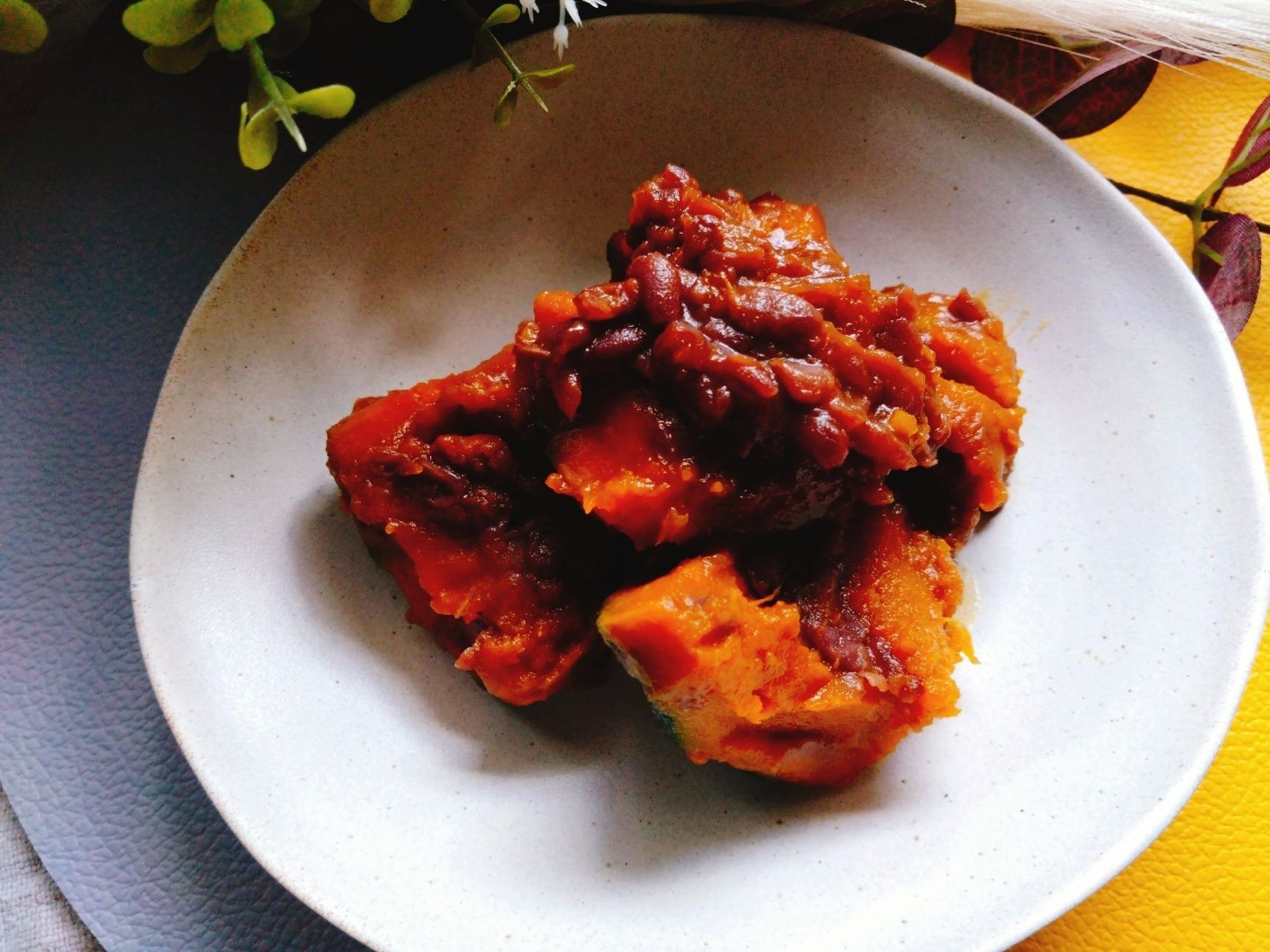 食べられている根菜と小豆を甘しょっぱく味つけた煮物。