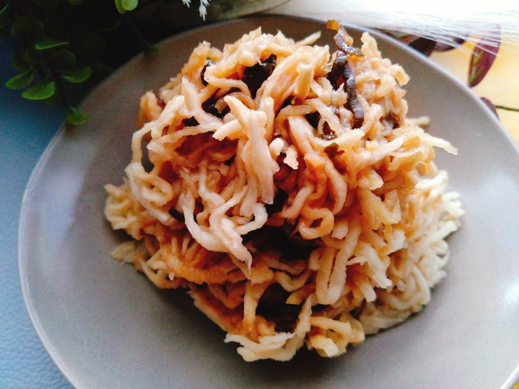 1.保存容器などに切り干し大根を入れ、お湯を入れて箸でほぐしながら