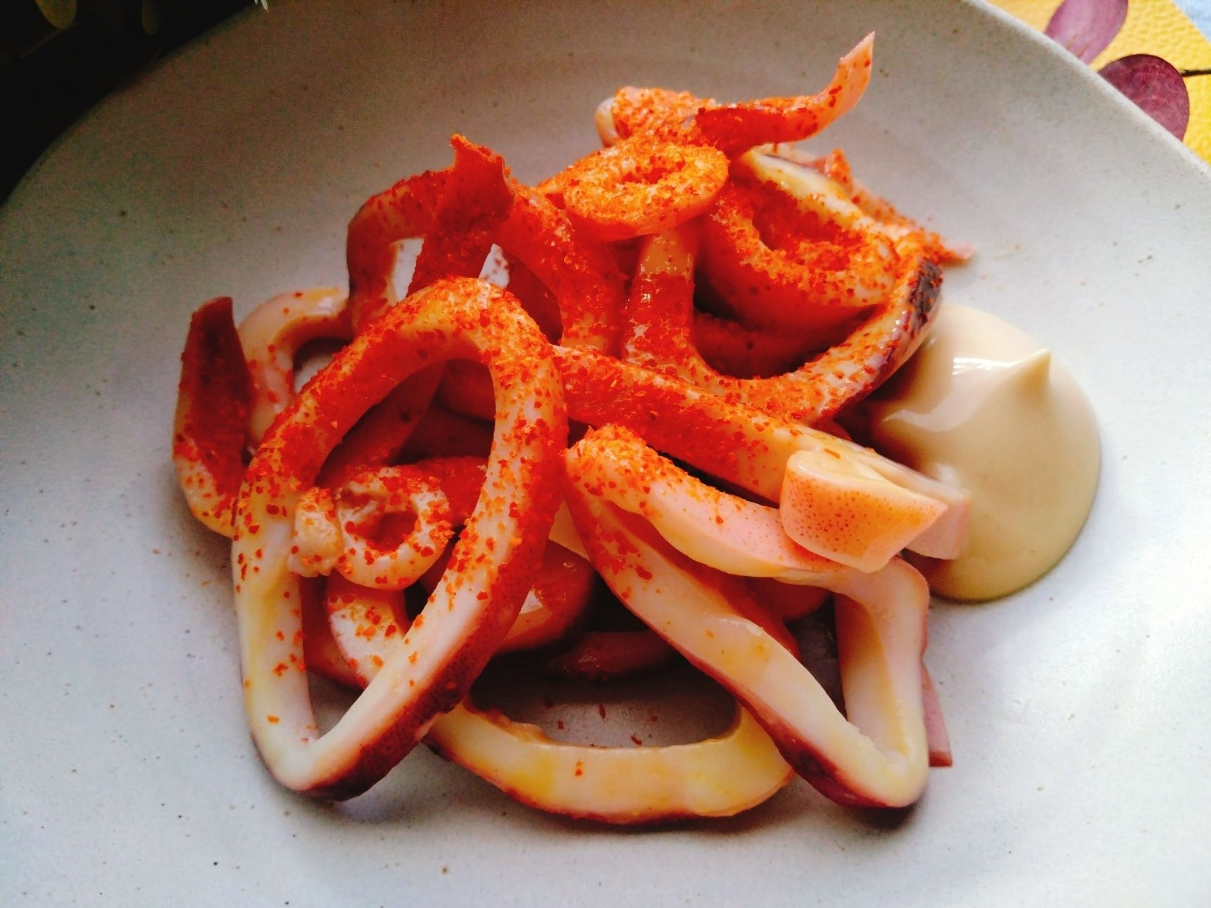 1.ボウルにイカと醤油を入れて、よく混ぜたら皿に盛り付ける。一味をふりかけマヨネーズを添えて、食べる直前に全体をよく混ぜて完成