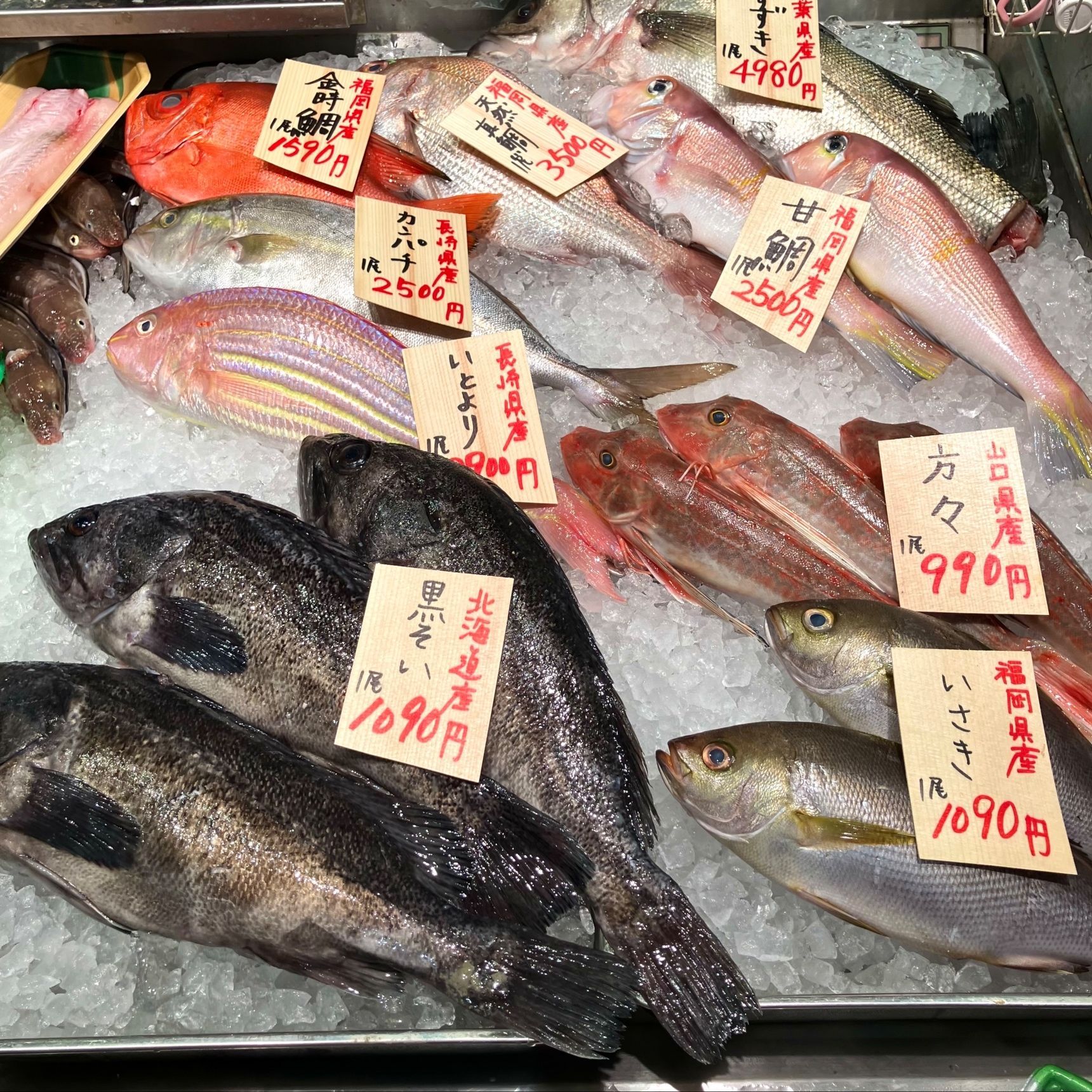 お店の方にお話を聞いてみたら、地域の天然魚が並ぶというよりは、東京は市場に入ってくる全国からのお魚が並ぶんじゃないかな、とのことでした。