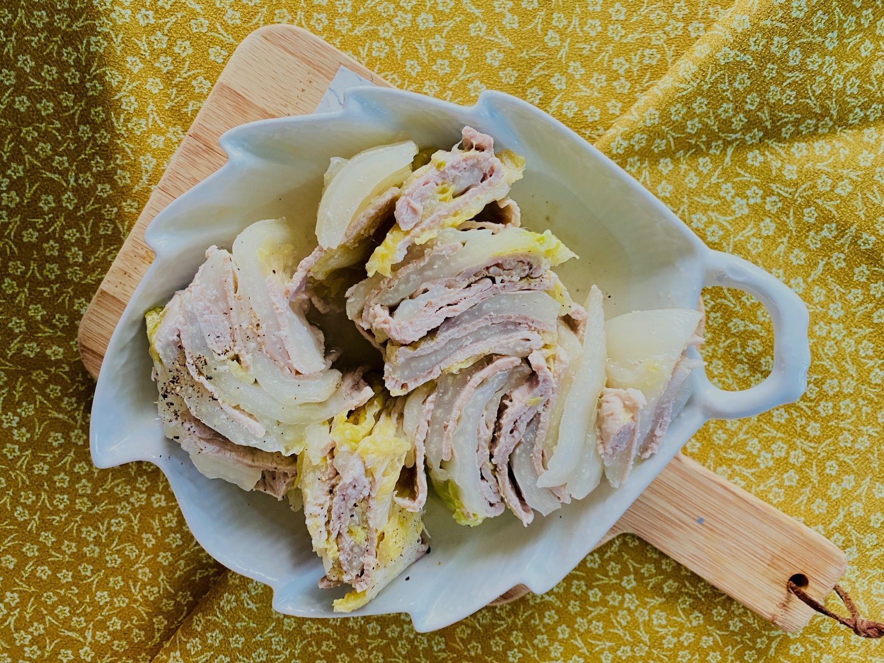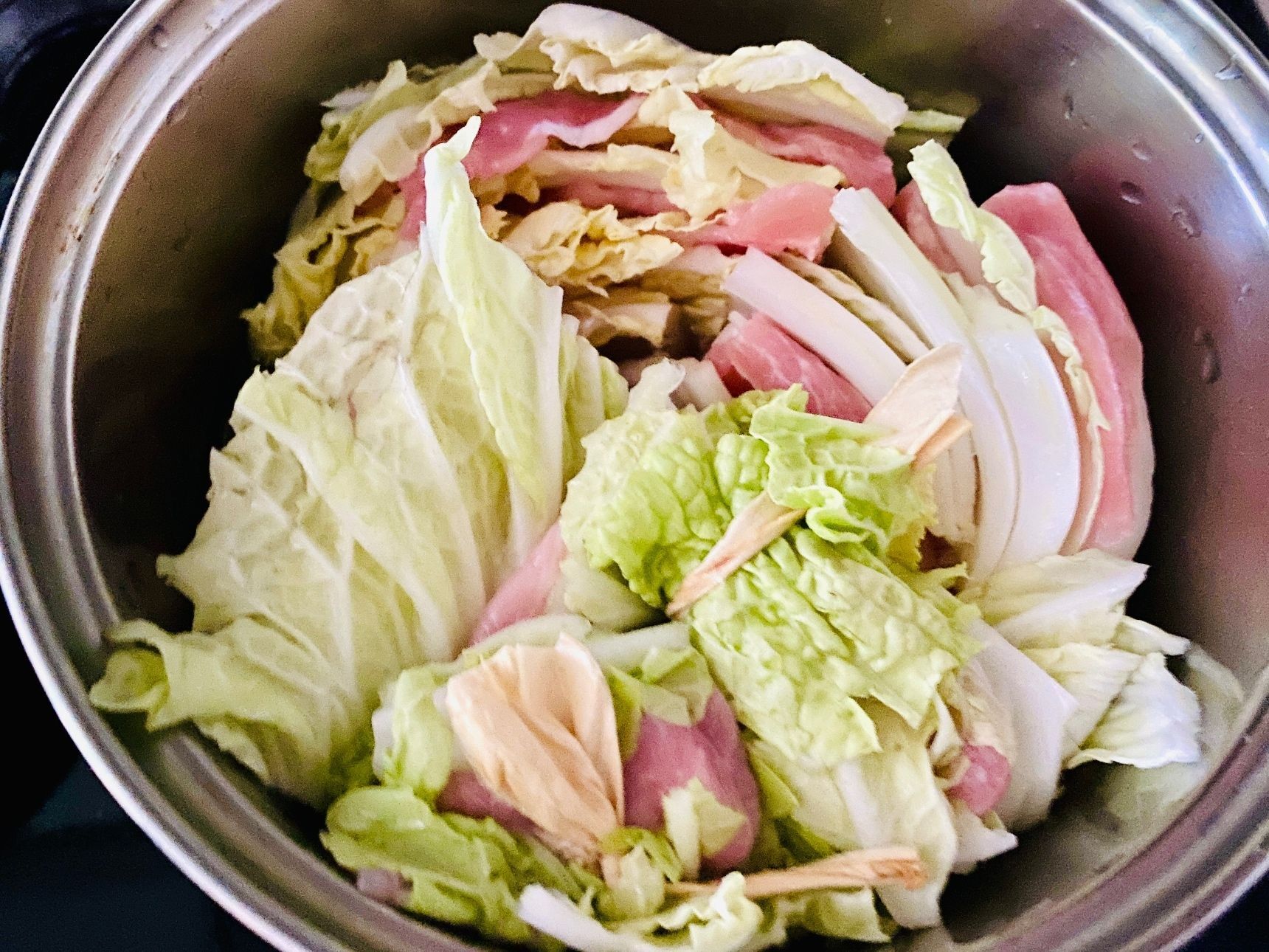 ②白菜の間に豚肉を挟んでおきます。3から4等分にカットして、鍋に隙間なく敷きつけます。