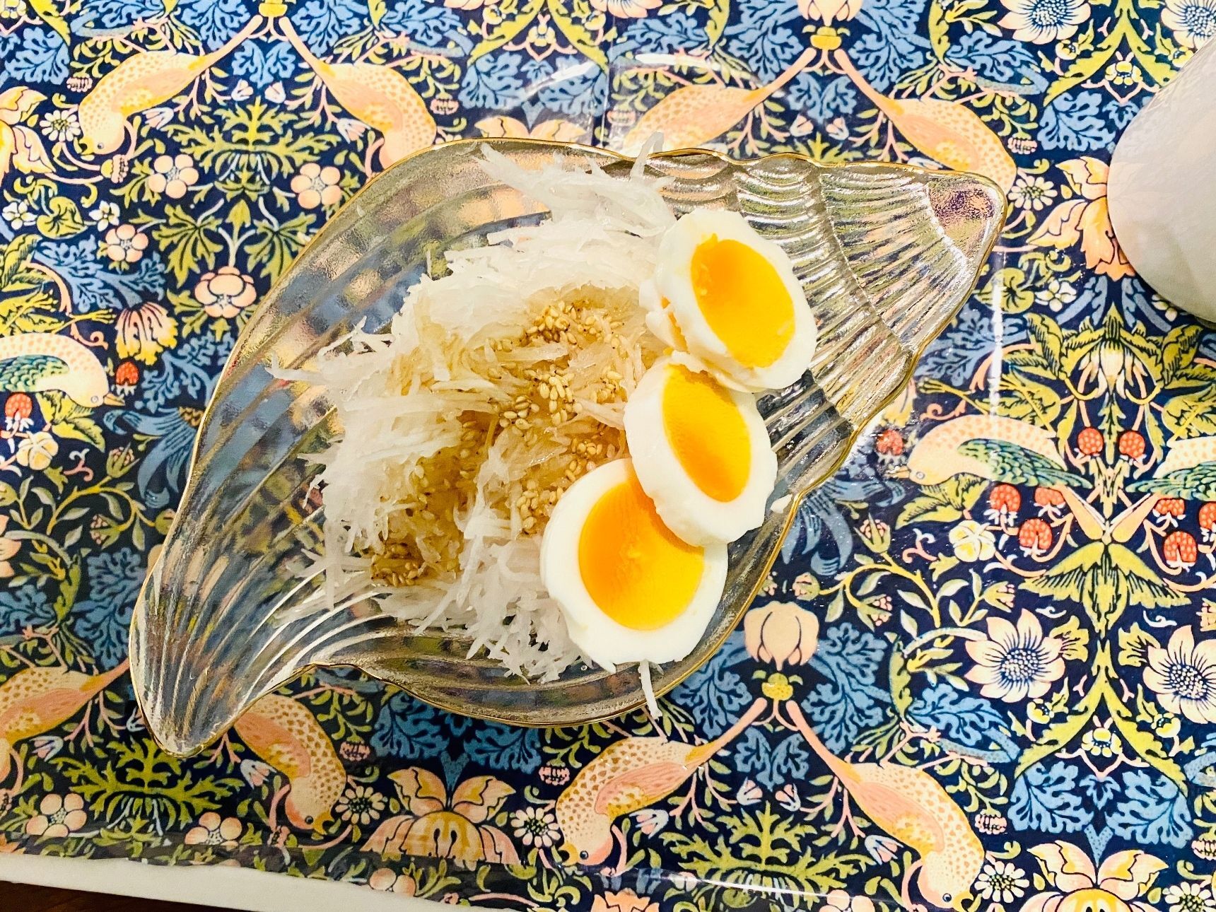1.大根は皮を剥いてせん切りにします(スライサーでもOK)。 2.大根をシャキッとさせたいので水に浸します。 3.よく水気を切り、器に盛り付けます。冷蔵庫にあったゆで卵を飾りました。 4.ボウルに、 aを混ぜ合わせ、ドレッシングの完成です。 食べる寸前にドレッシングをかけてお召し上がり下さい。