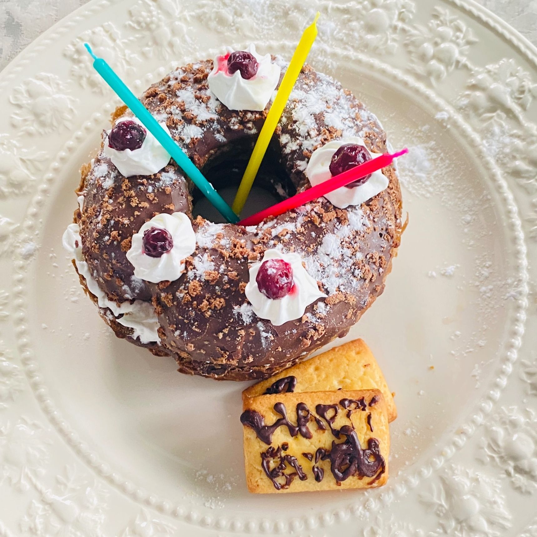 間にホイップクリームをサンドして、またホイップクリーム、ブルーベリー、粉砂糖、クッキーにチョコペンでHappy Birthday(今月誕生日のものがいるので)と描いてみました。