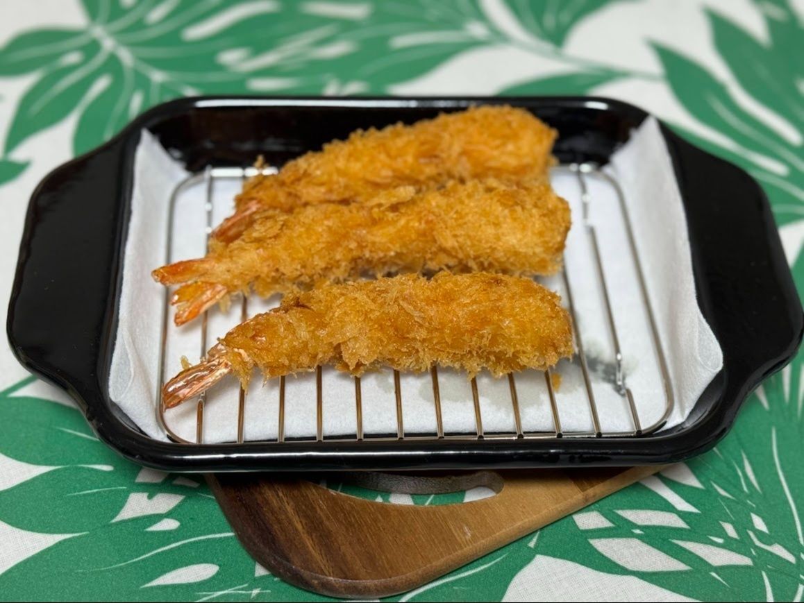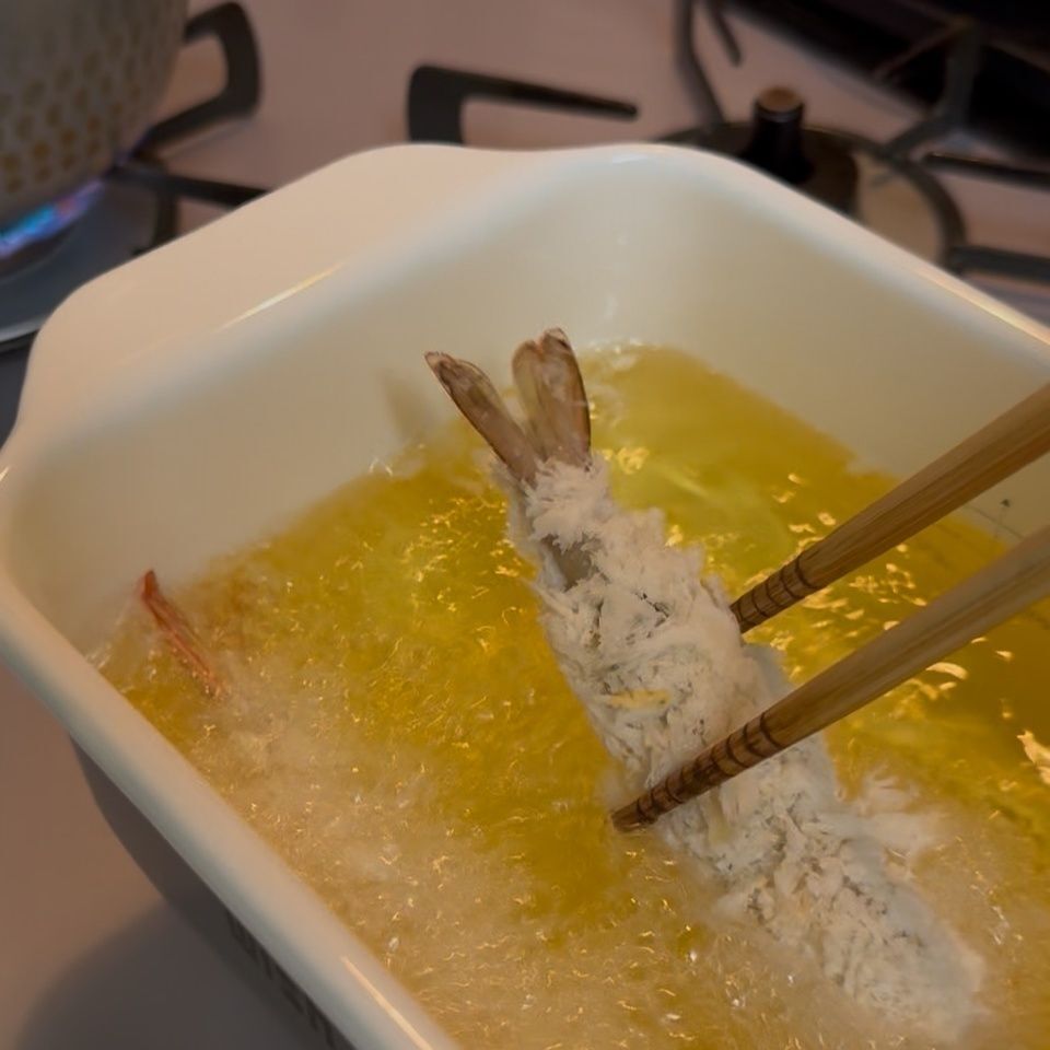 角型なので小さいけど長い素材を揚げることができるので、長い素材を上げるために大きな鍋を用意する必要がありません。海老フライを揚げてみました。