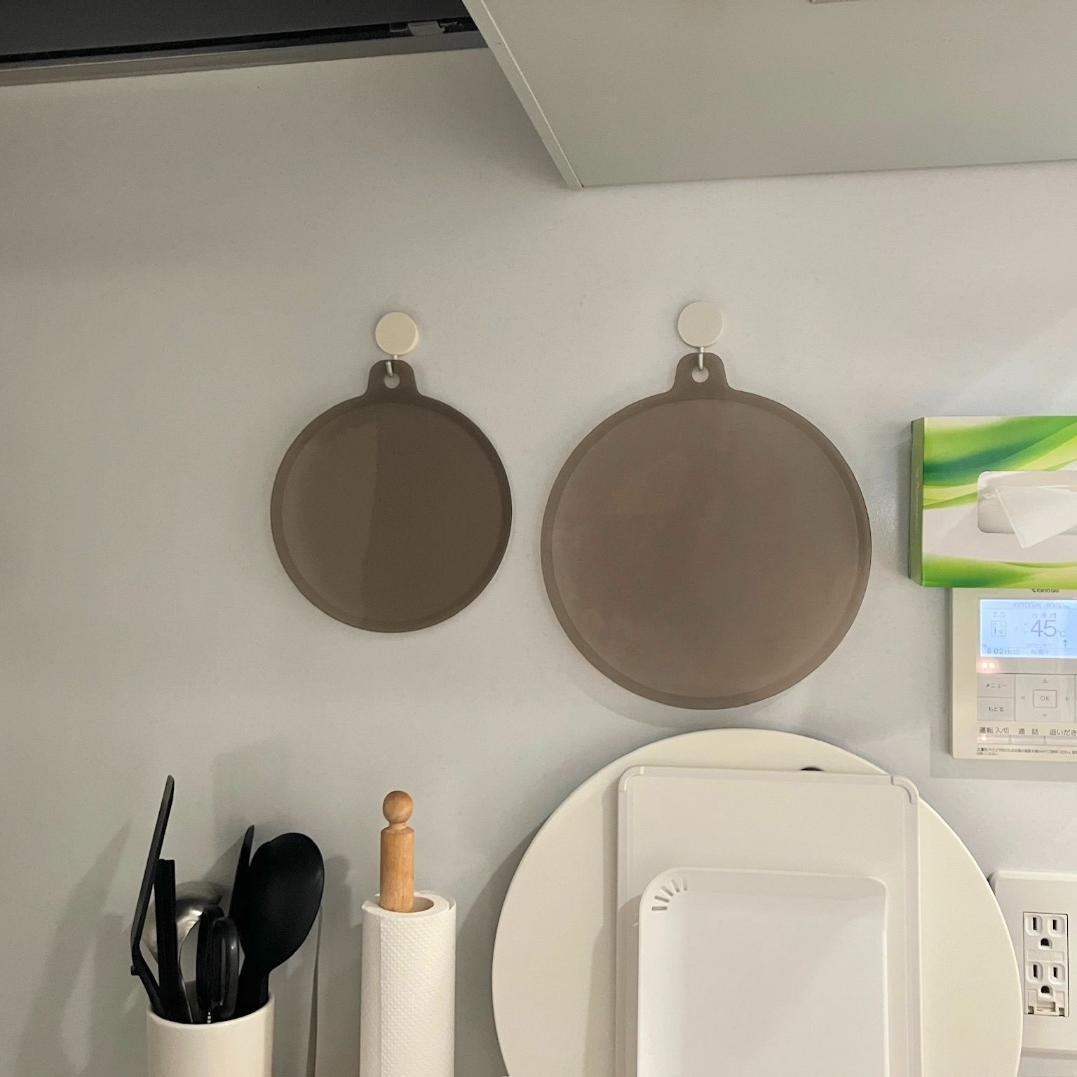 シリコーン蓋には引っ掛けて収納できるように穴があいていますので、写真のようにフックに引っ掛けて収納することができます。