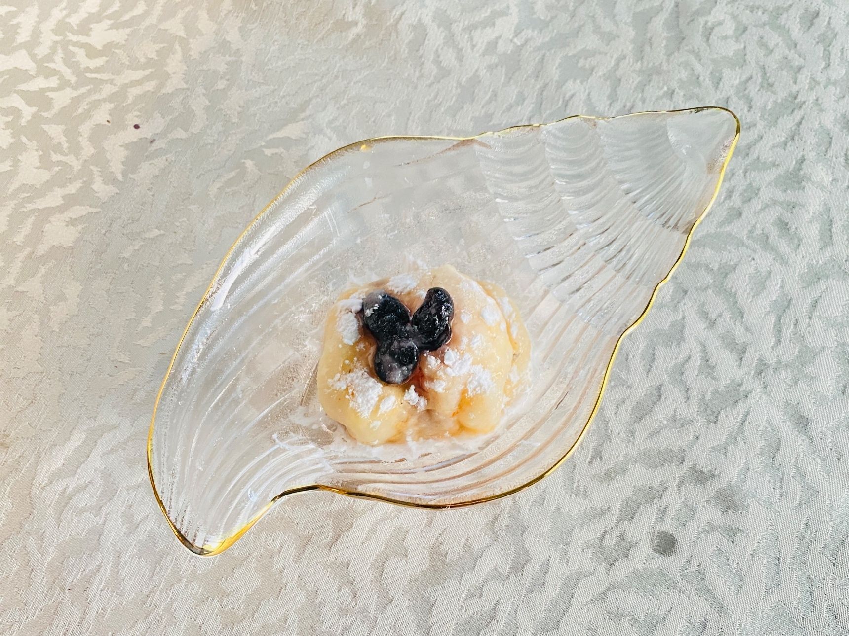 ③お餅を薄く伸ばし、①を包みます。包み終わりは下にします。