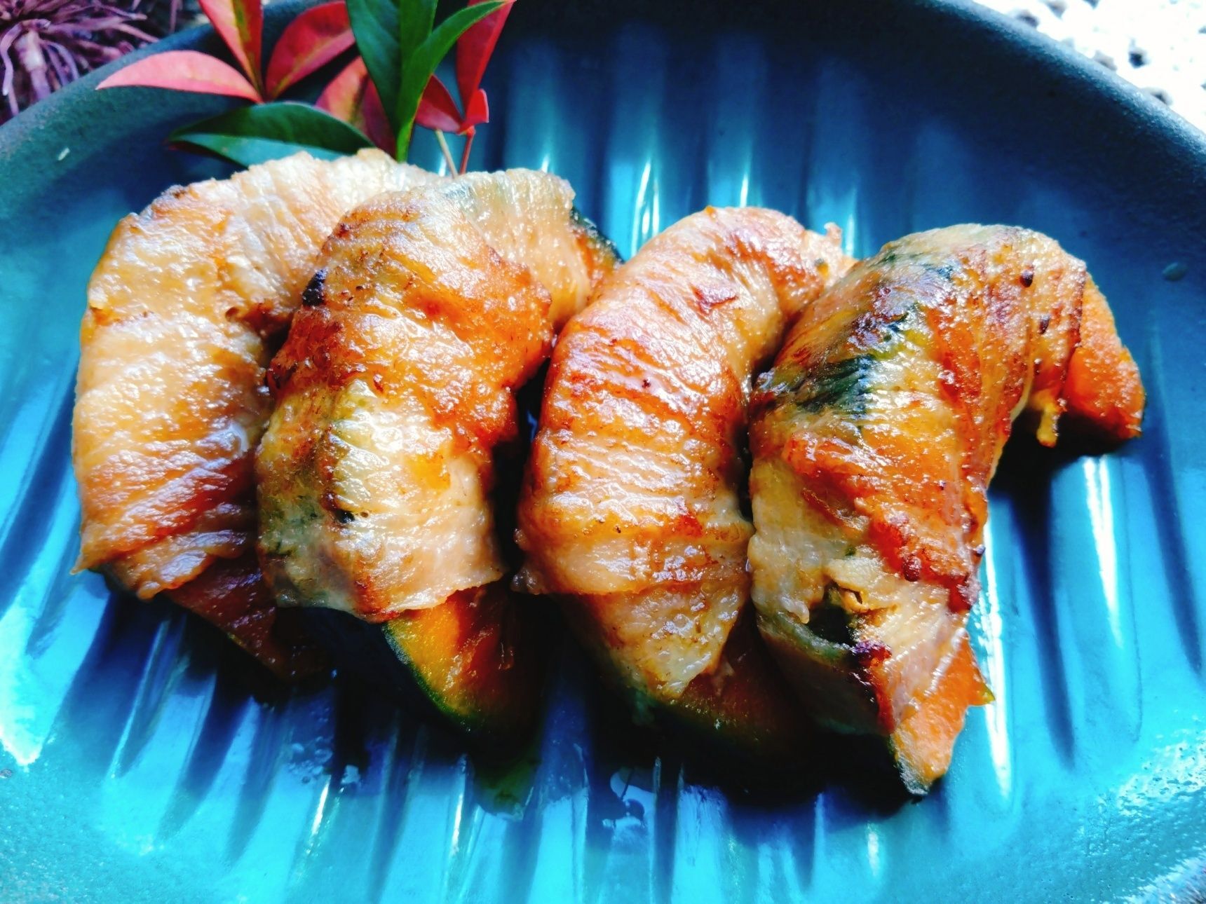 1.豚肉の水気をふき取ったらかぼちゃ1かけに豚肉1枚をらせん状に巻いて、手でぎゅっと握って整える