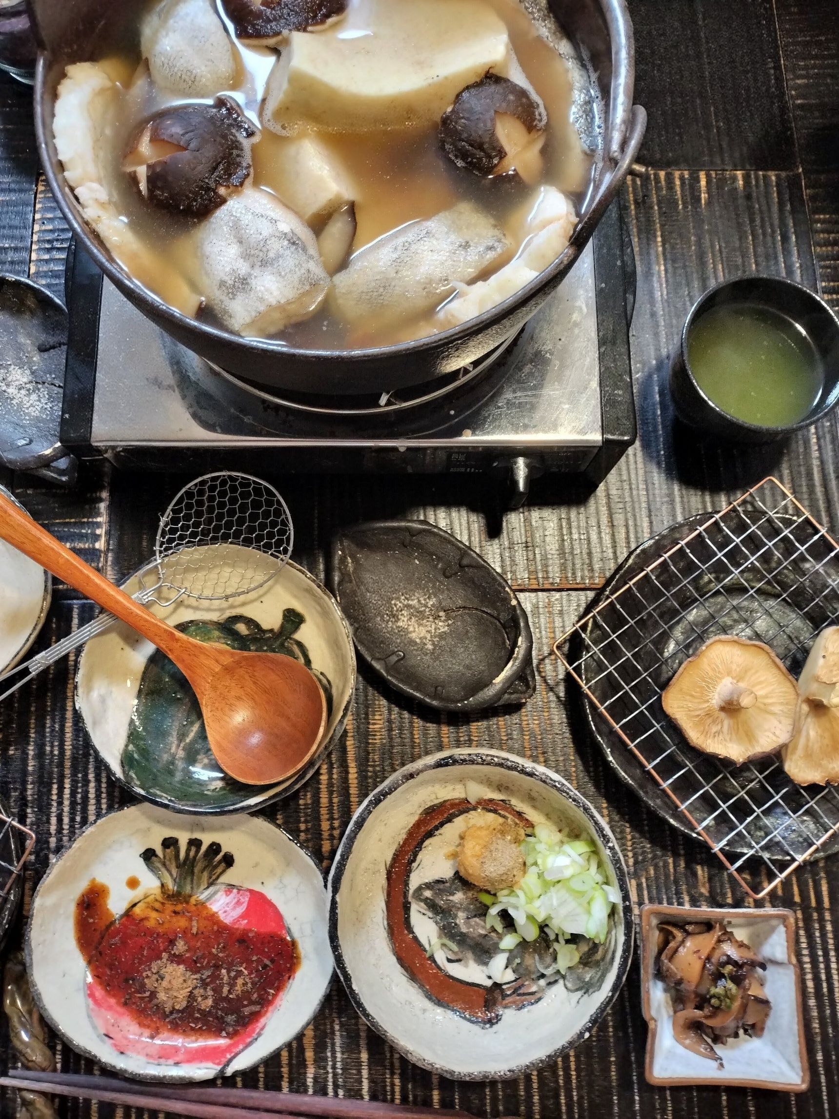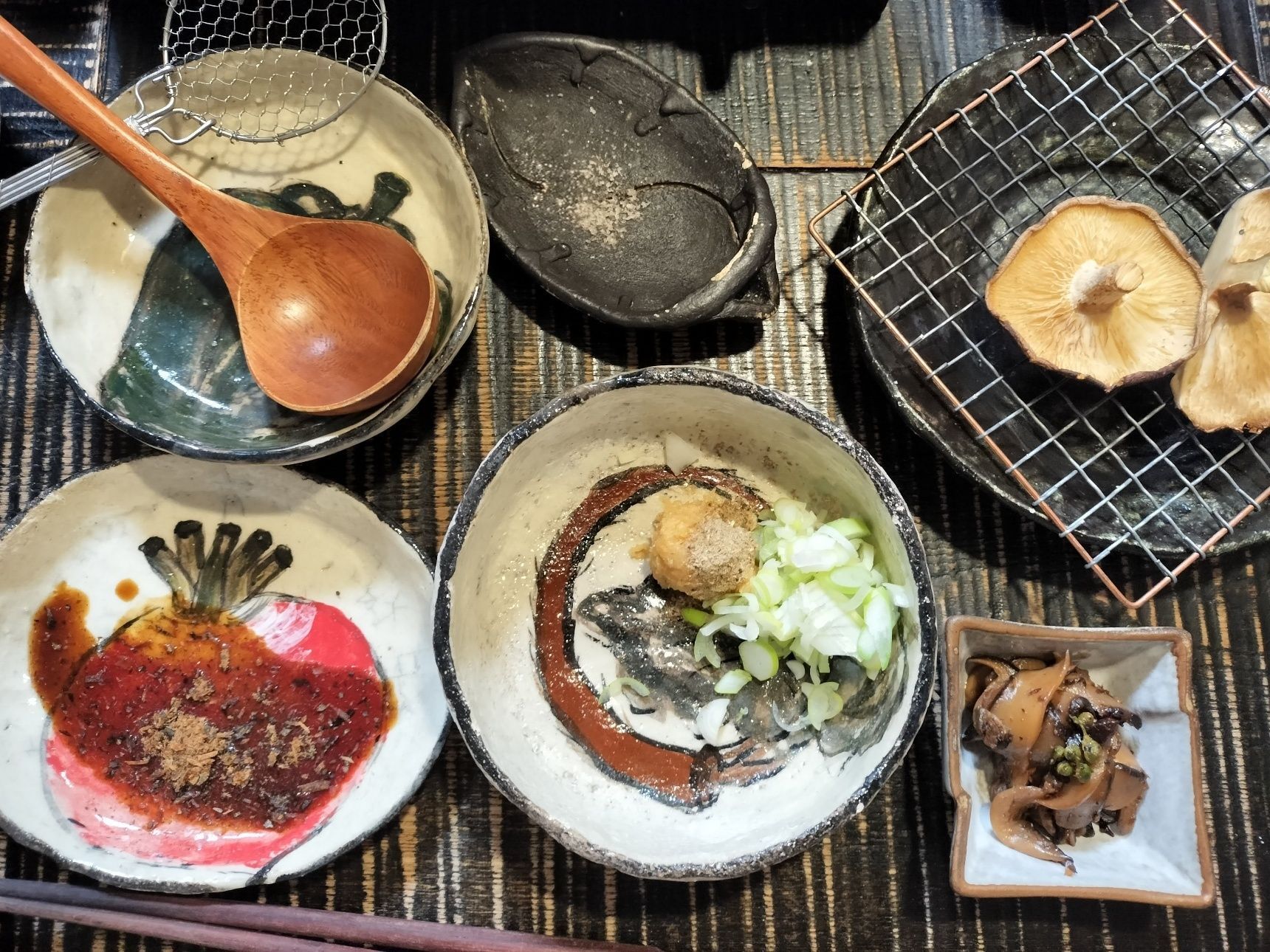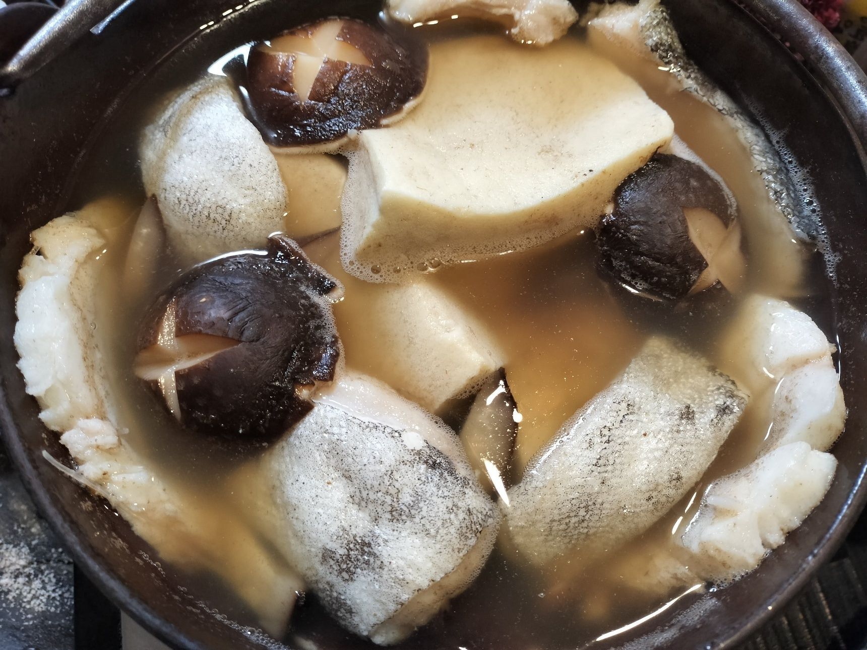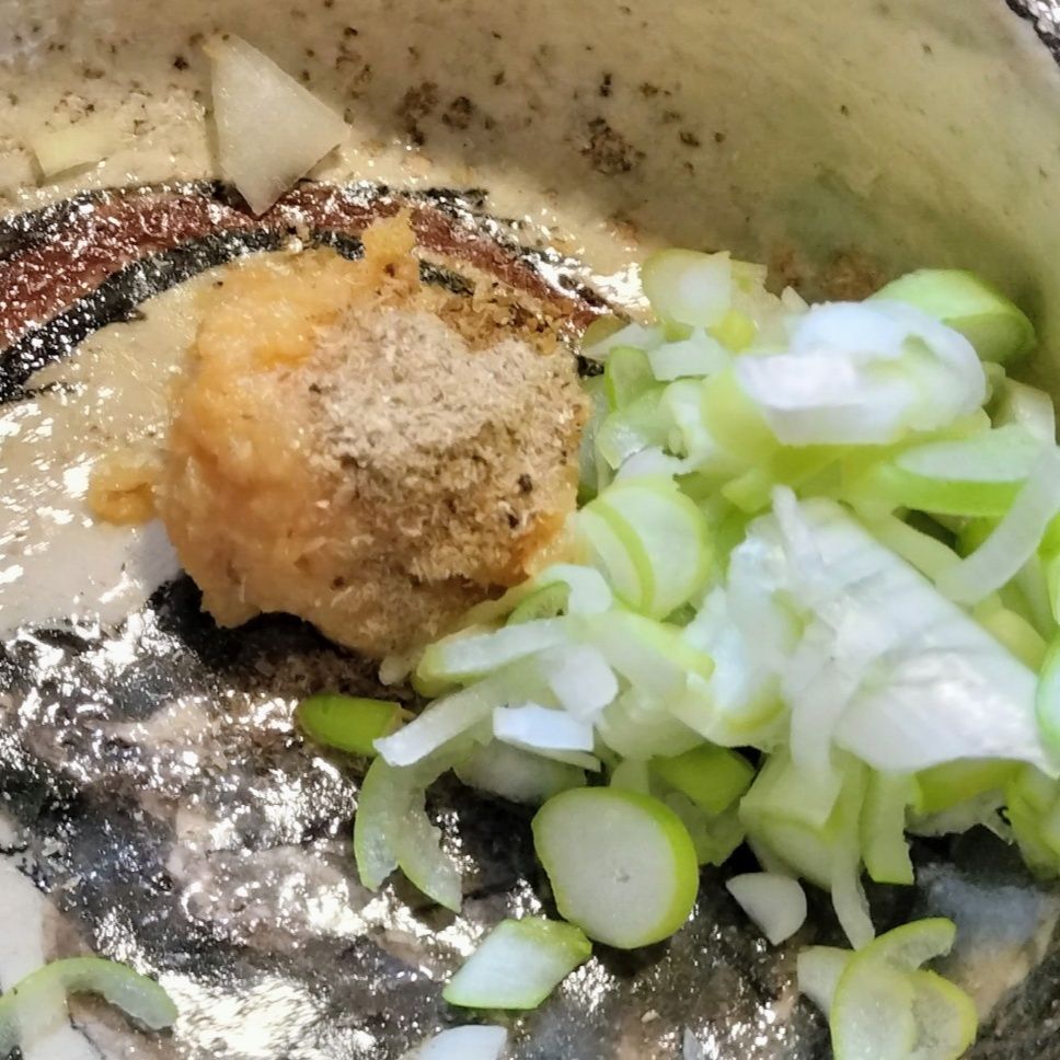 器に、鱈ちり鍋の濃厚だしをお玉ですくって注ぎ入れ、フンドーキン合わせ味噌と長ネギと粉末煮干しを入れて軽く混ぜる