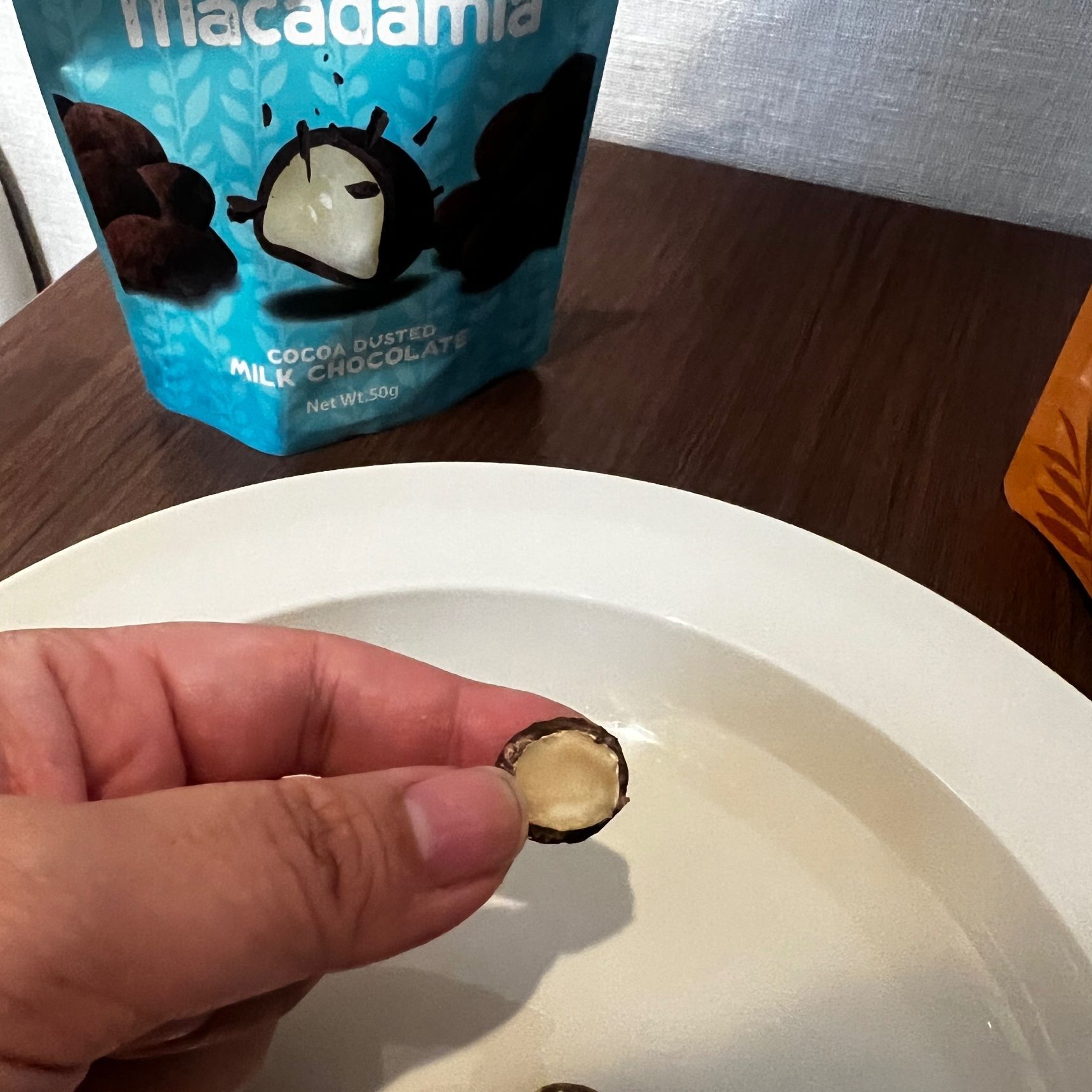 マカダミアはしっかりごろっと入っていて感動!パッケージよりは小ぶりですが、薄がけチョコなので重くなくパクパク食べられます。
