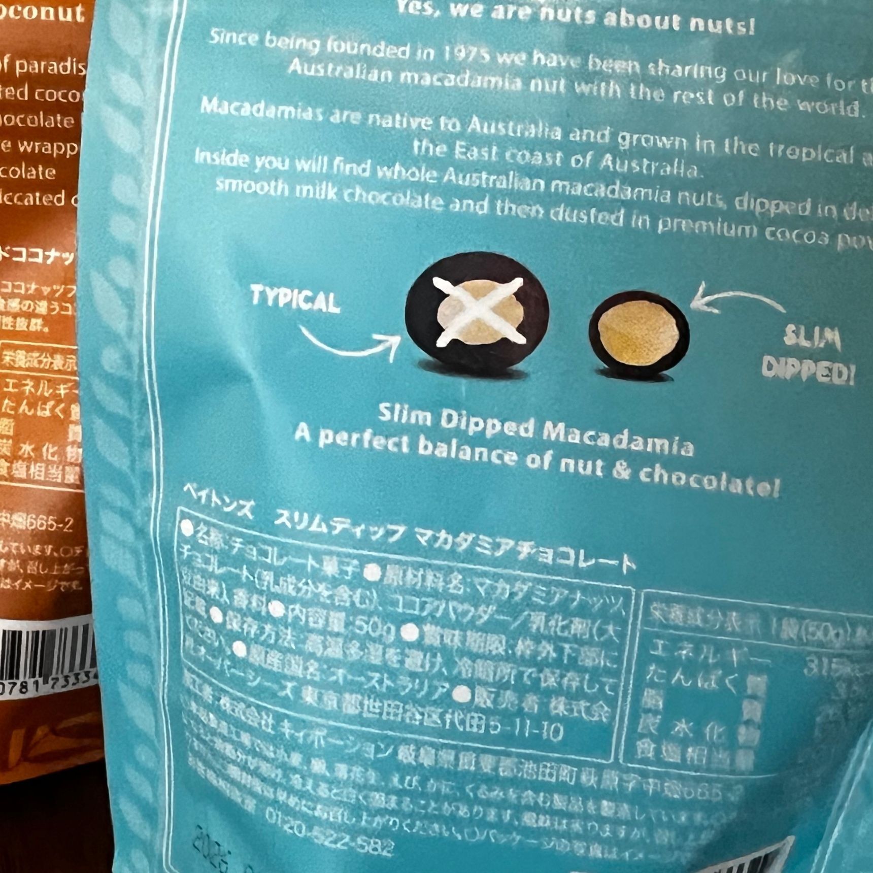 マカダミアのパッケージの裏には、周りのチョコが薄がけなこともアピール。