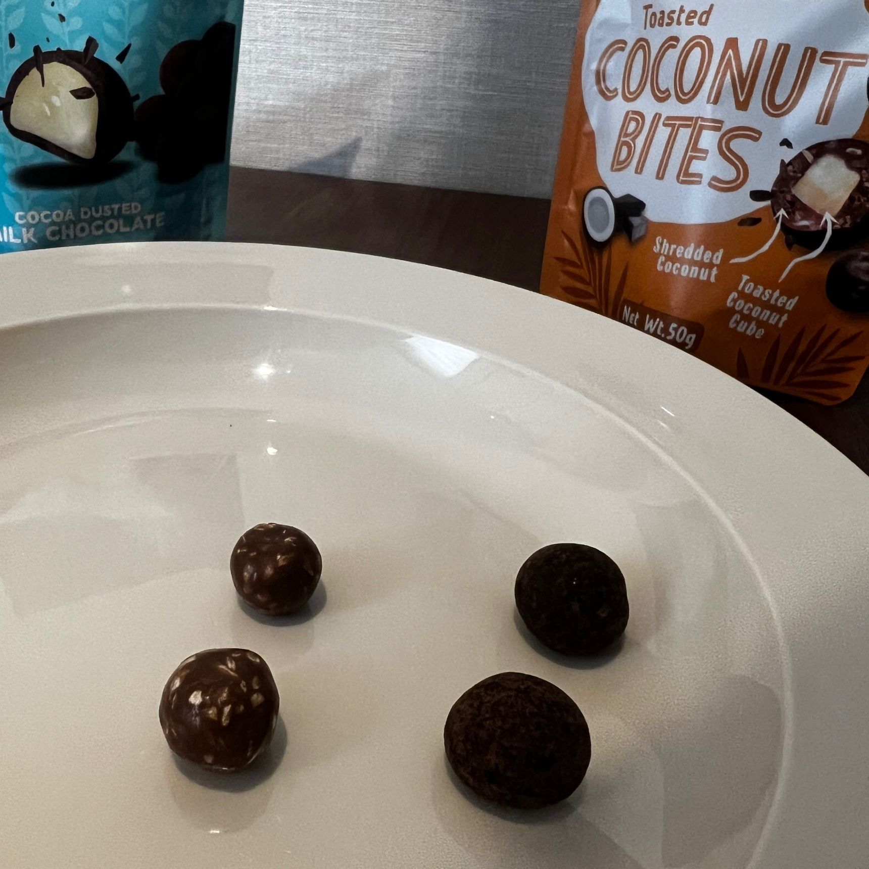 ちなみに、クランチが見えているほうがココナッツで、マットなココアパウダーのほうがマカダミアです。(お皿に逆に出してしまいました。)