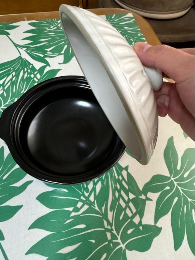 ダイソーには19cmのちいさなひとり用にちょうどいい土鍋が売っています。ダイソーの土鍋は持ち手部分が凹んでいて、ふたが箸置きになります。
