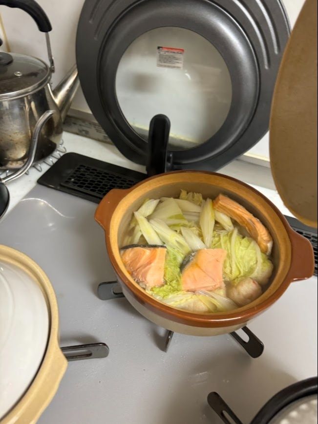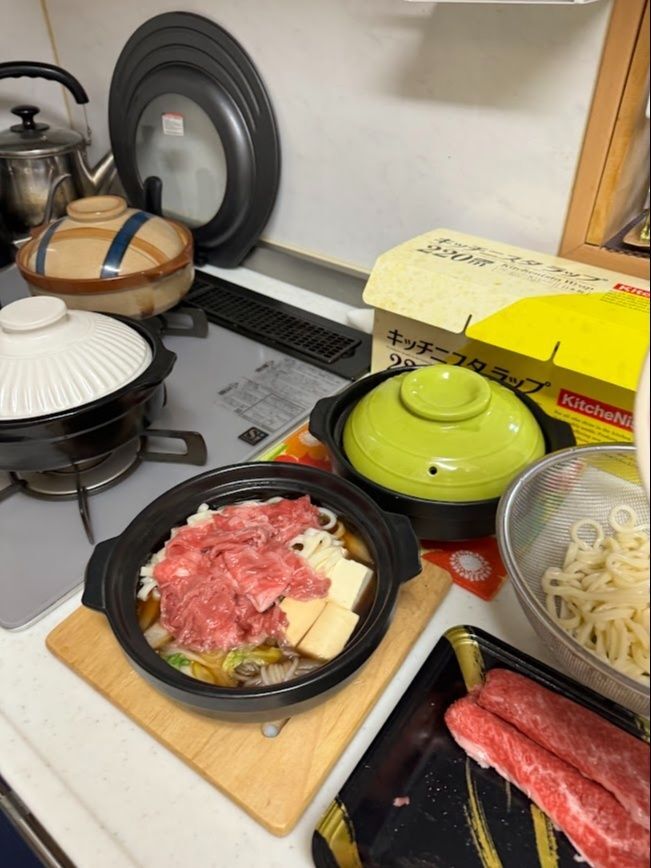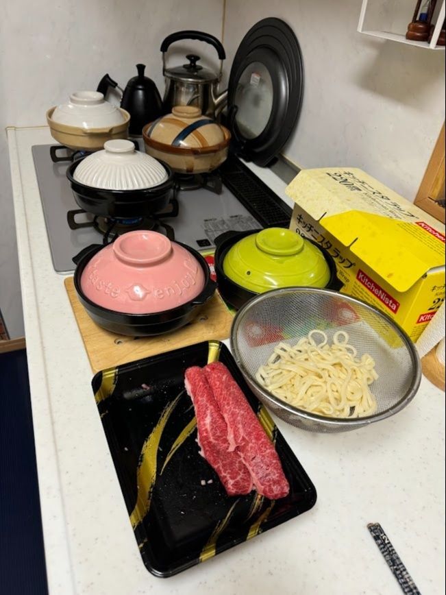 実はわが家、以前から3COINSなどでちいさい土鍋をたくさん買ってあります。今回、娘婿用に買い足しました。娘夫婦が遊びに来たときはすきやき風うどんを作ります。大きな土鍋で作るよりも遠慮しないで食べやすいからです。お店みたいと娘婿も喜んで食べてくれます。