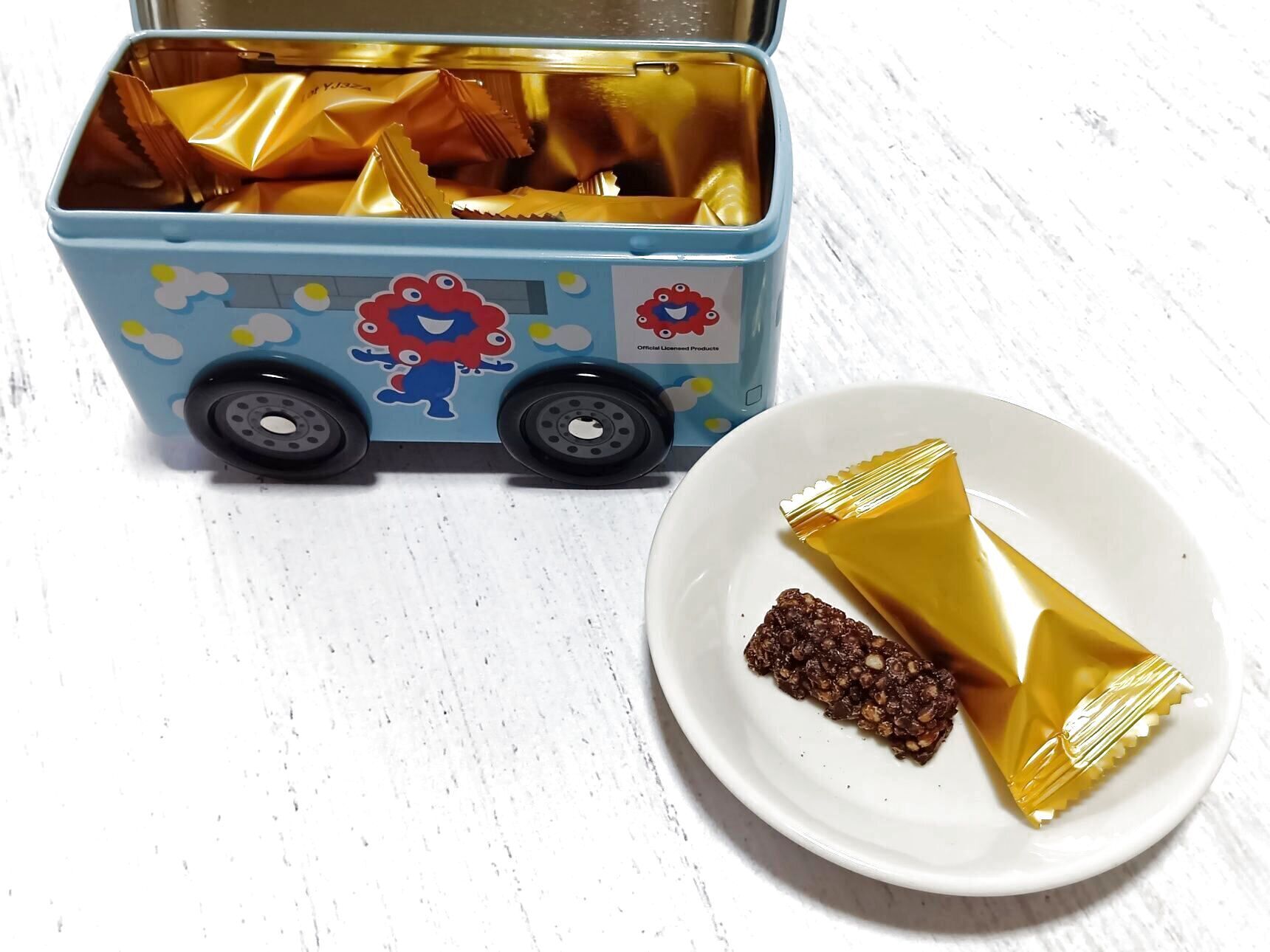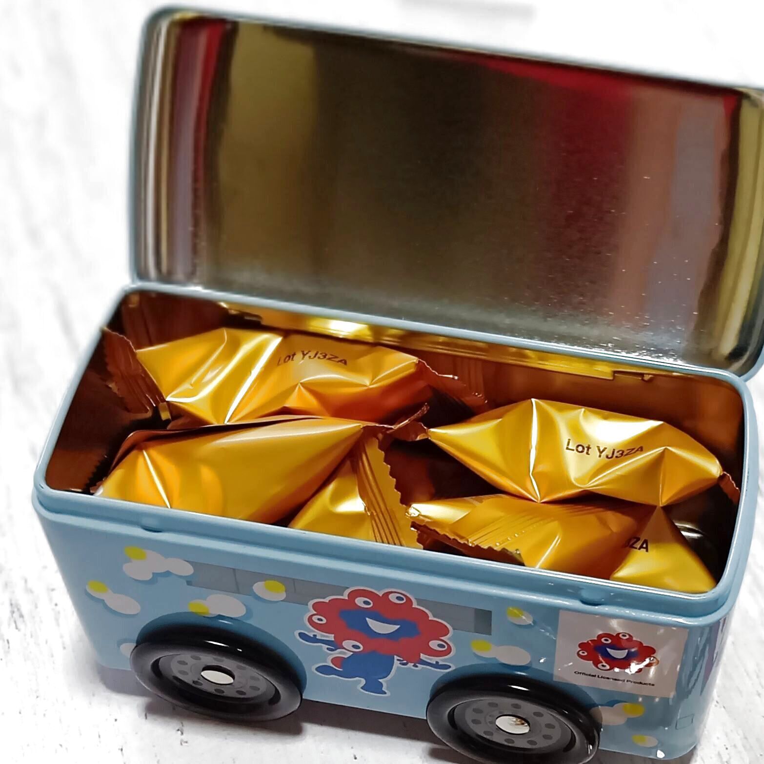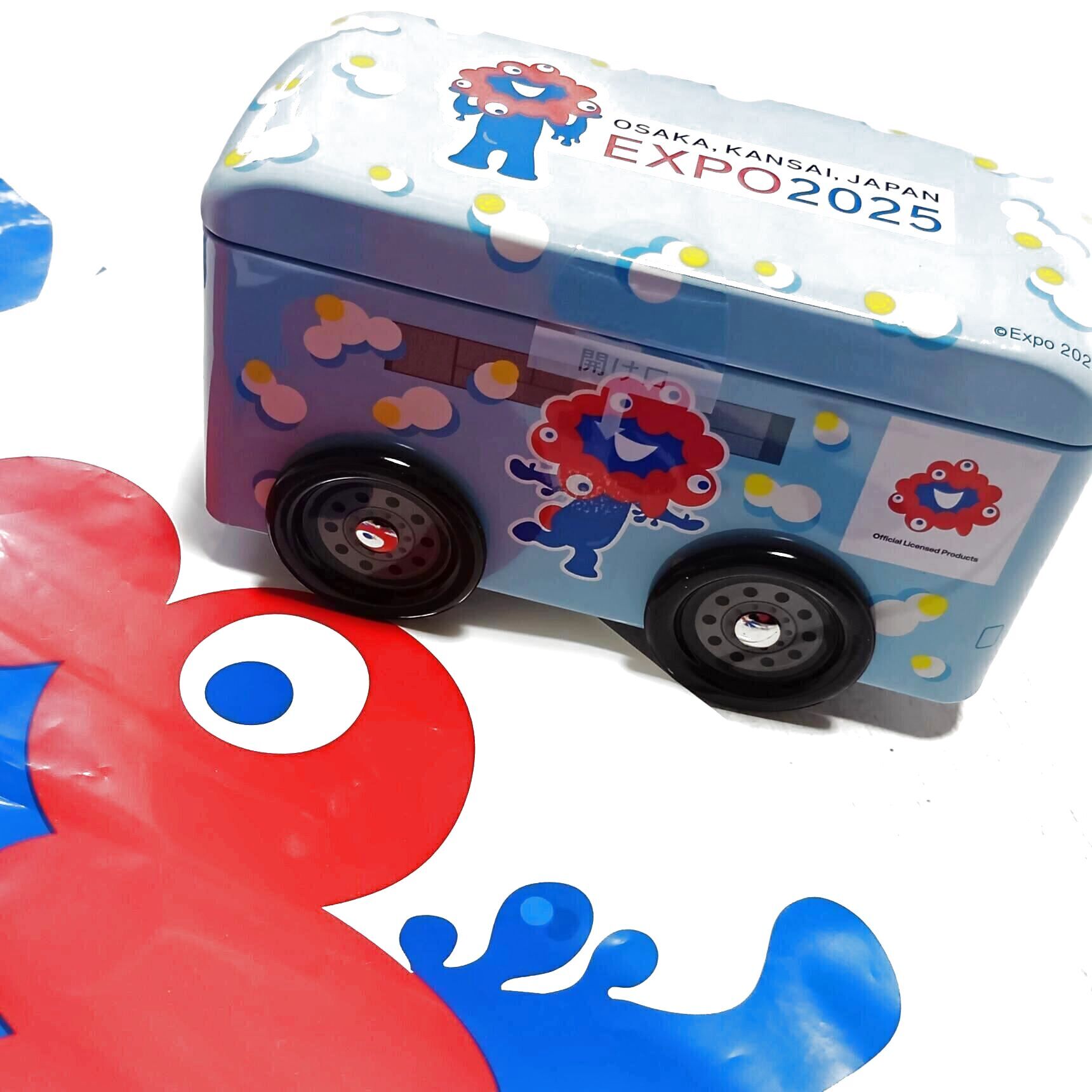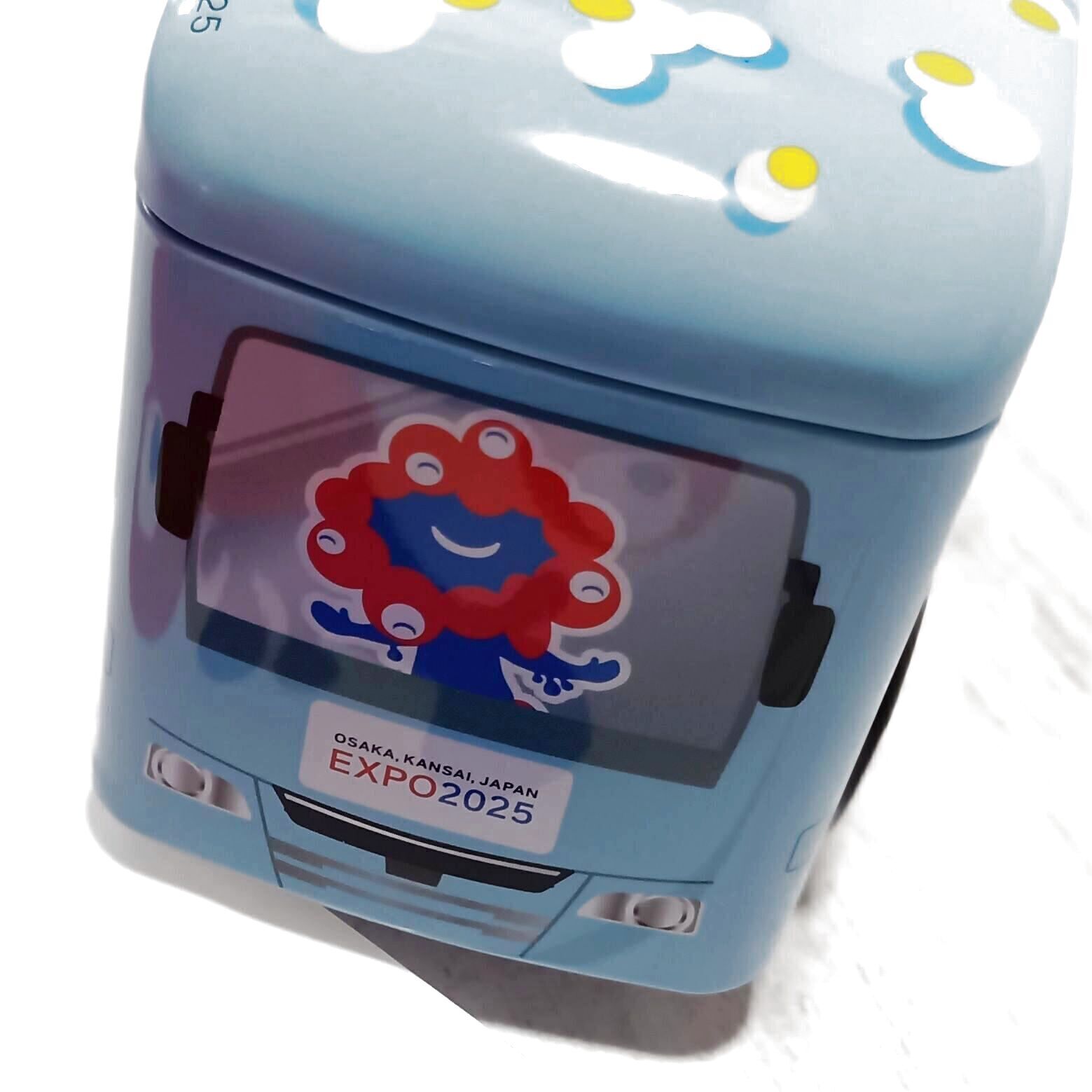 こちらのお菓子缶なんですが、水色のバスで後ろの窓から、ミャクミャクがニッコリ微笑んでいるんです!