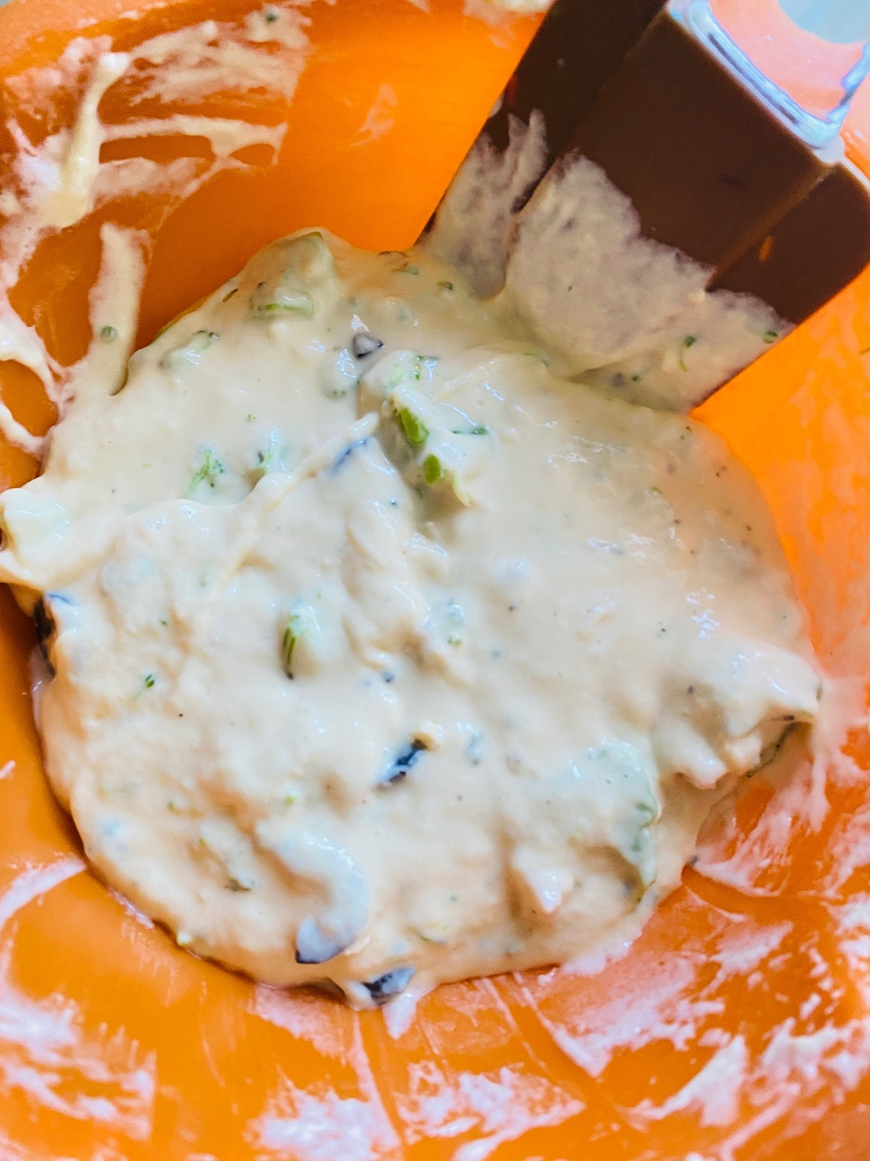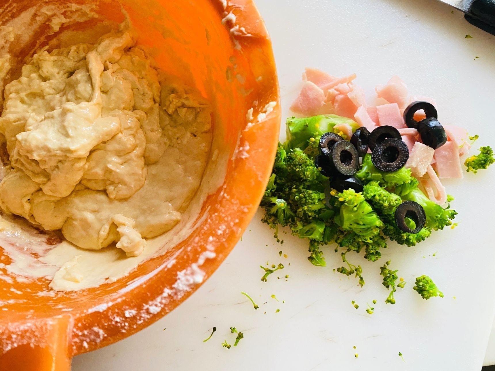 ④ ③に細く切ったはハムやブロッコリー、オリーブを入れよく混ぜます。パルメザンチーズ、塩胡椒を加えよく混ぜます。