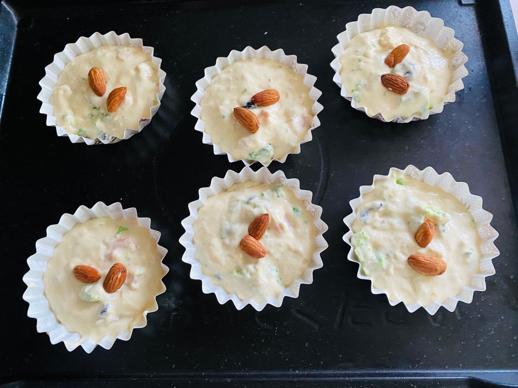 ⑥ お好みのケーキカップに入れます。上にアーモンドをのせて、180度に温めたオーブンで20分ぐらい焼きます。焼き上がり時間は調整して下さい。