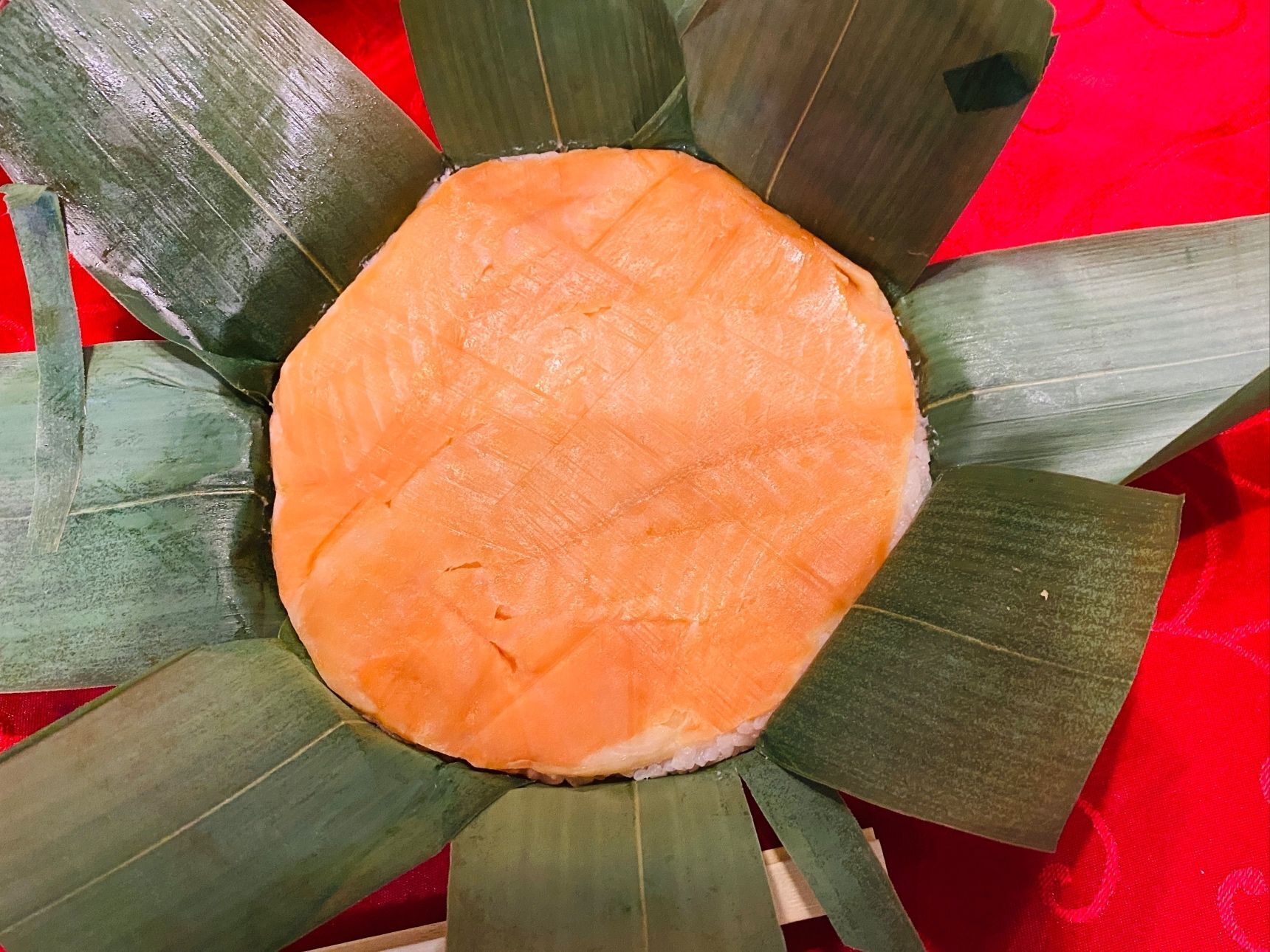 笹を1枚1枚めくると綺麗なサーモンピンクのます寿司が敷き詰められています。