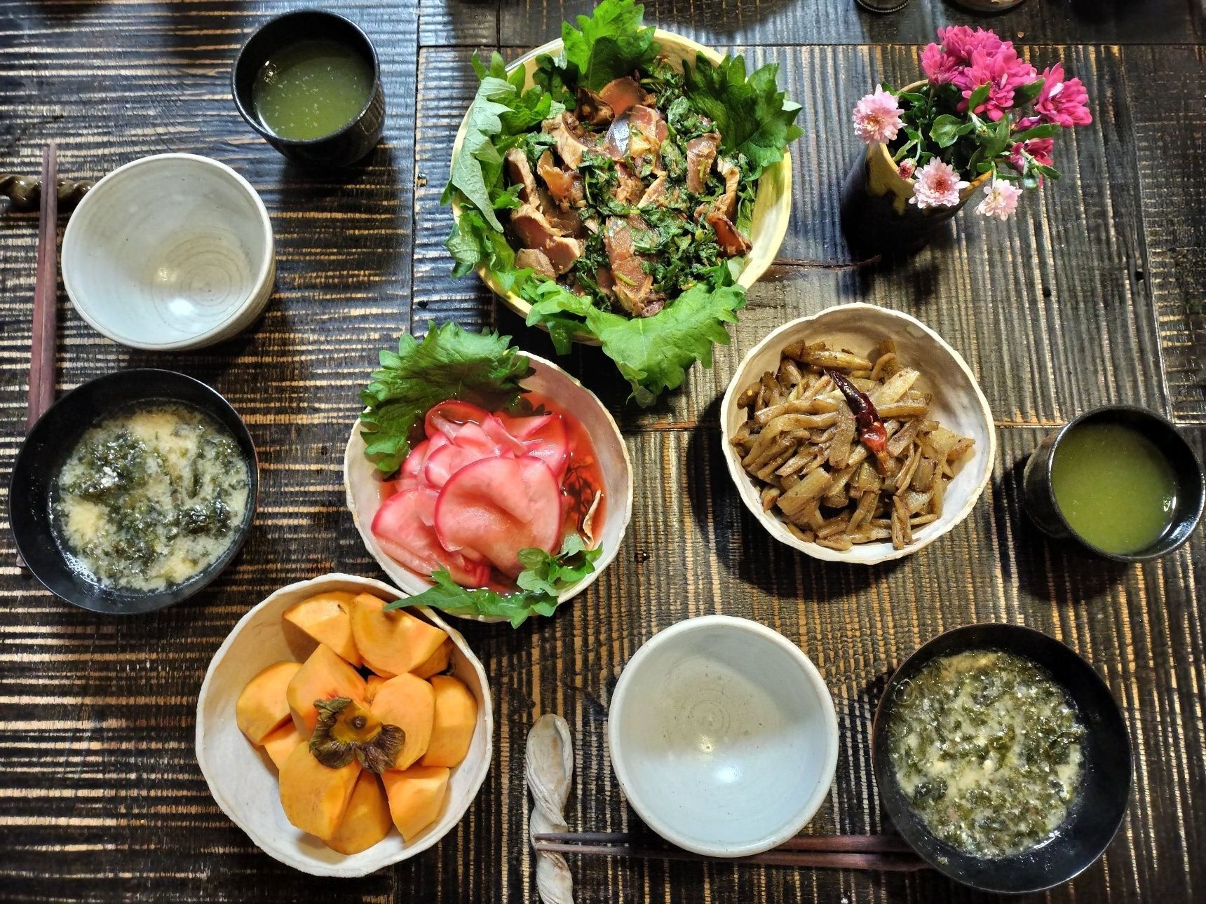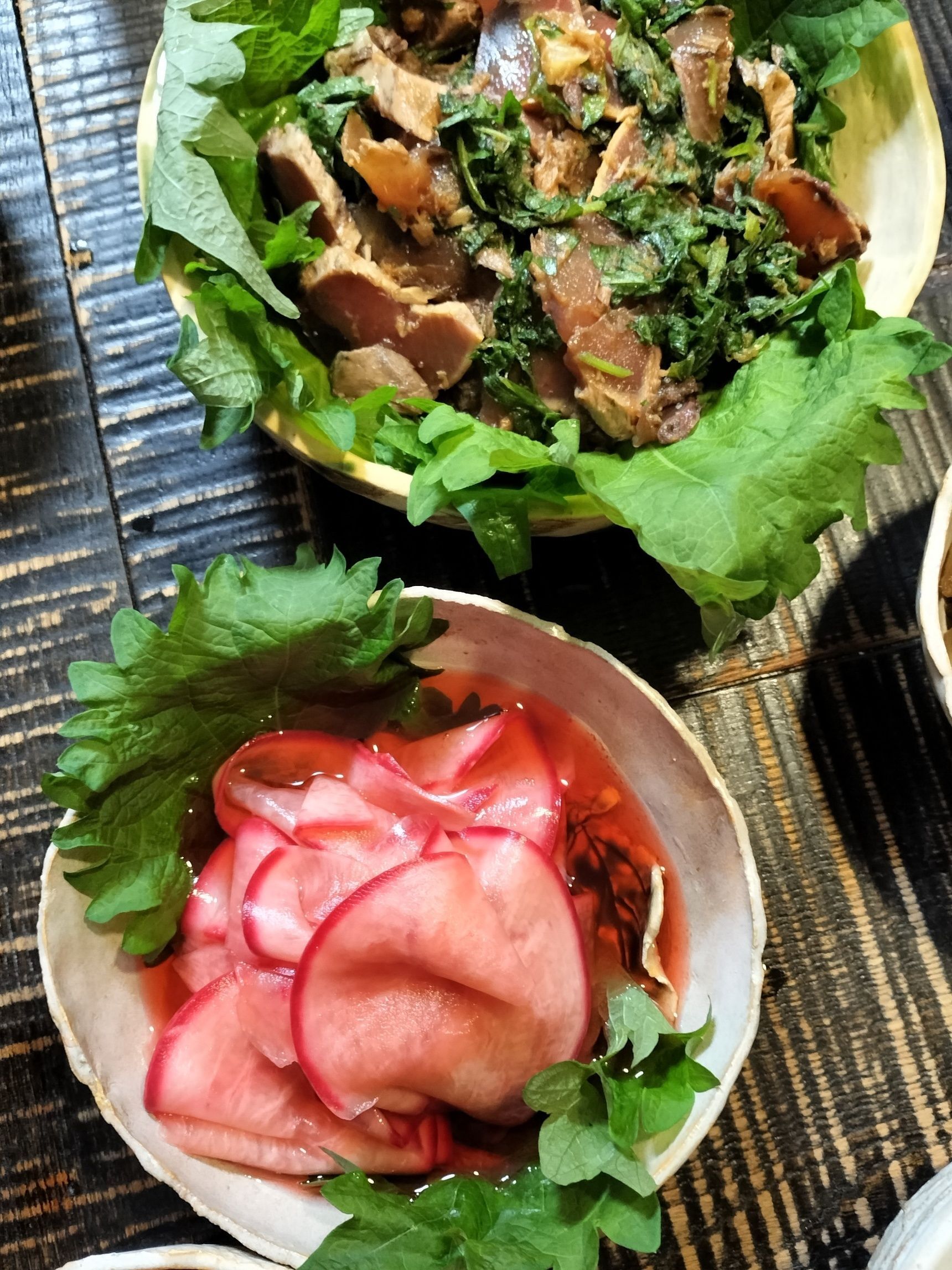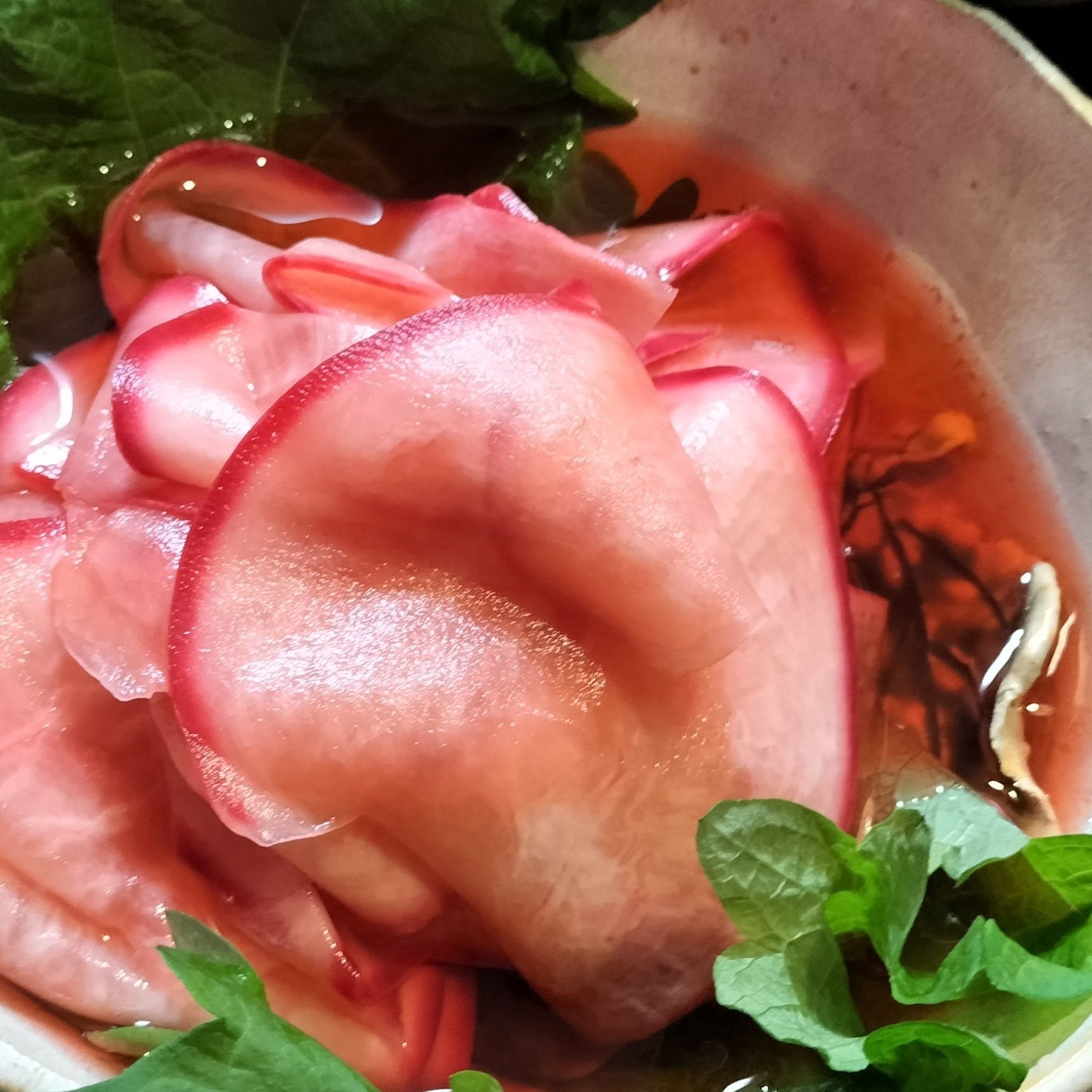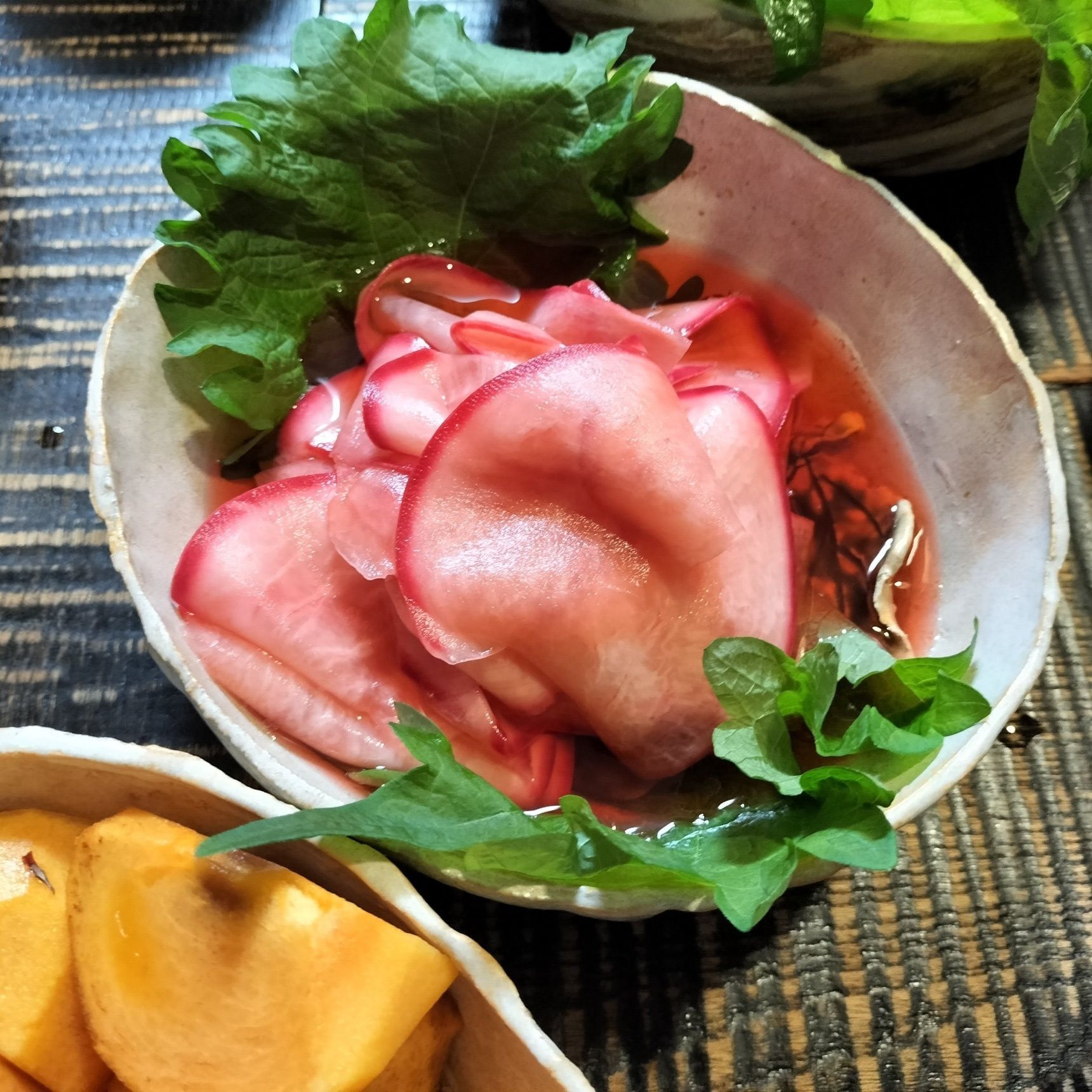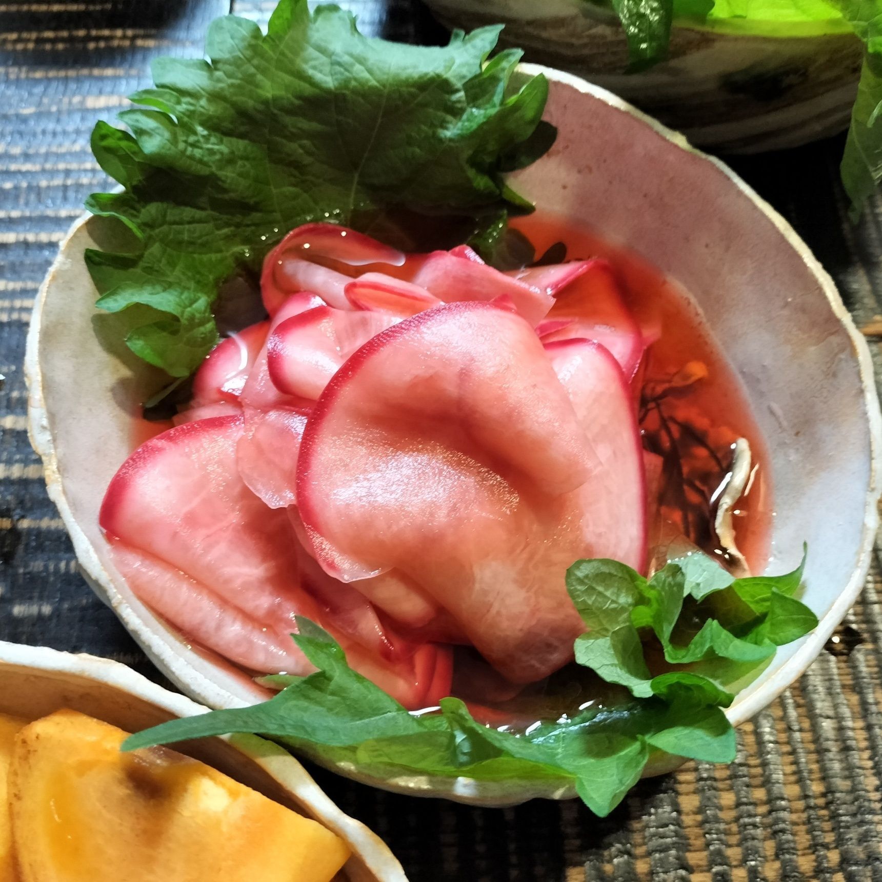 3. 器に大葉をのせ、赤かぶの甘酢漬けを盛り付ける