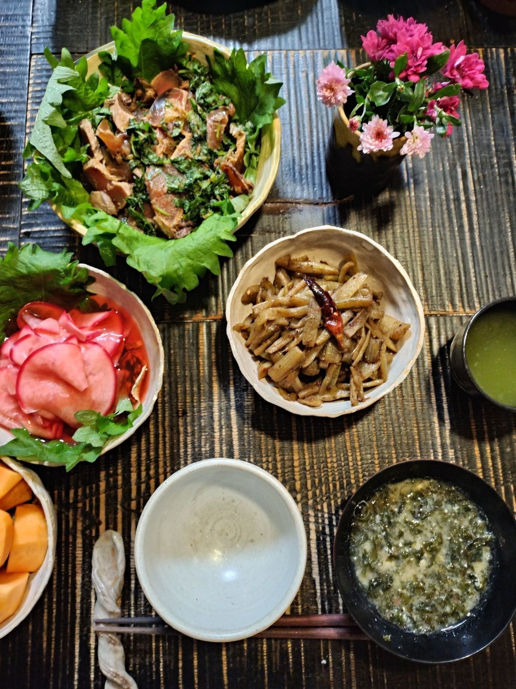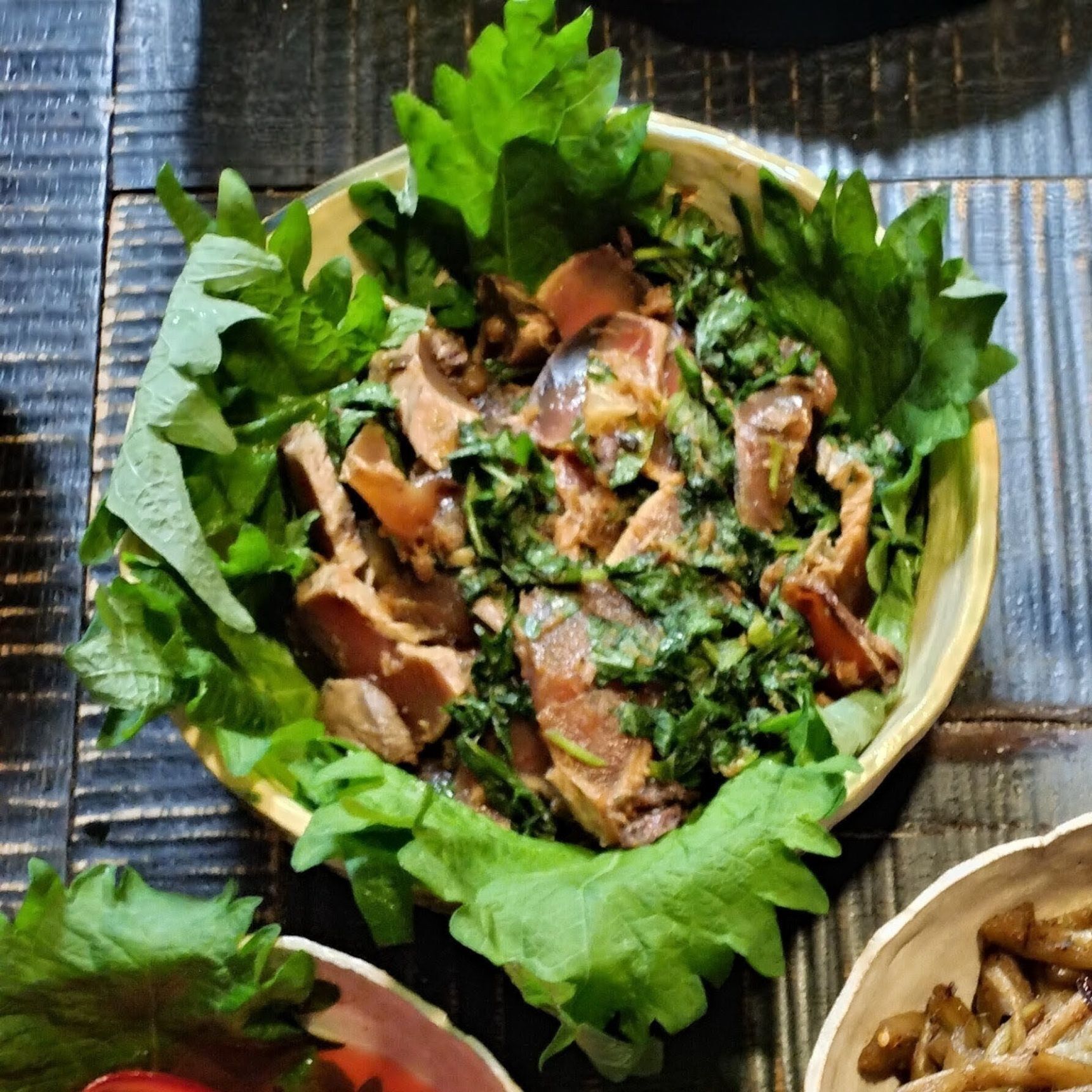 1. かつおのたたきを切り、ボウルに入れる→材料●を加えて軽く混ぜる→冷蔵庫で30分程漬け込む