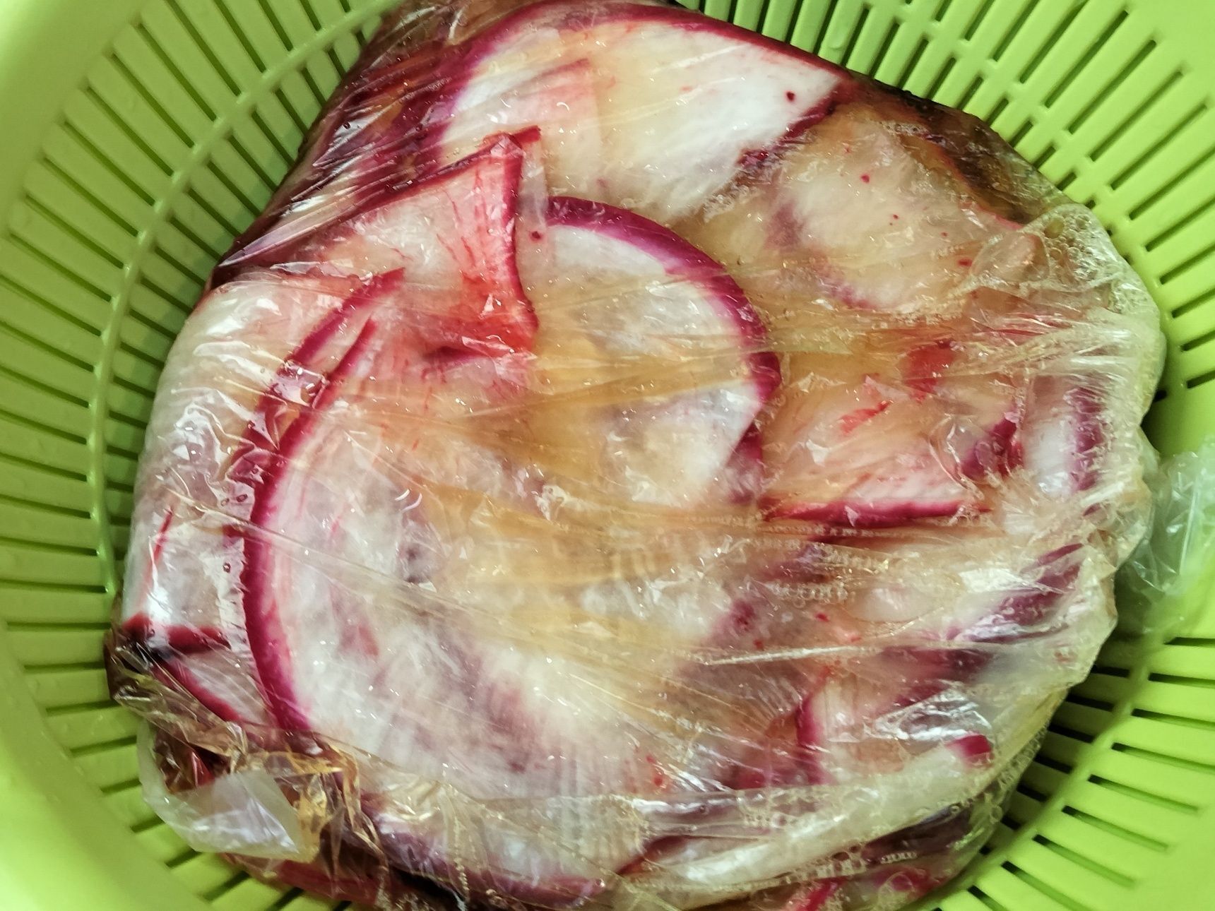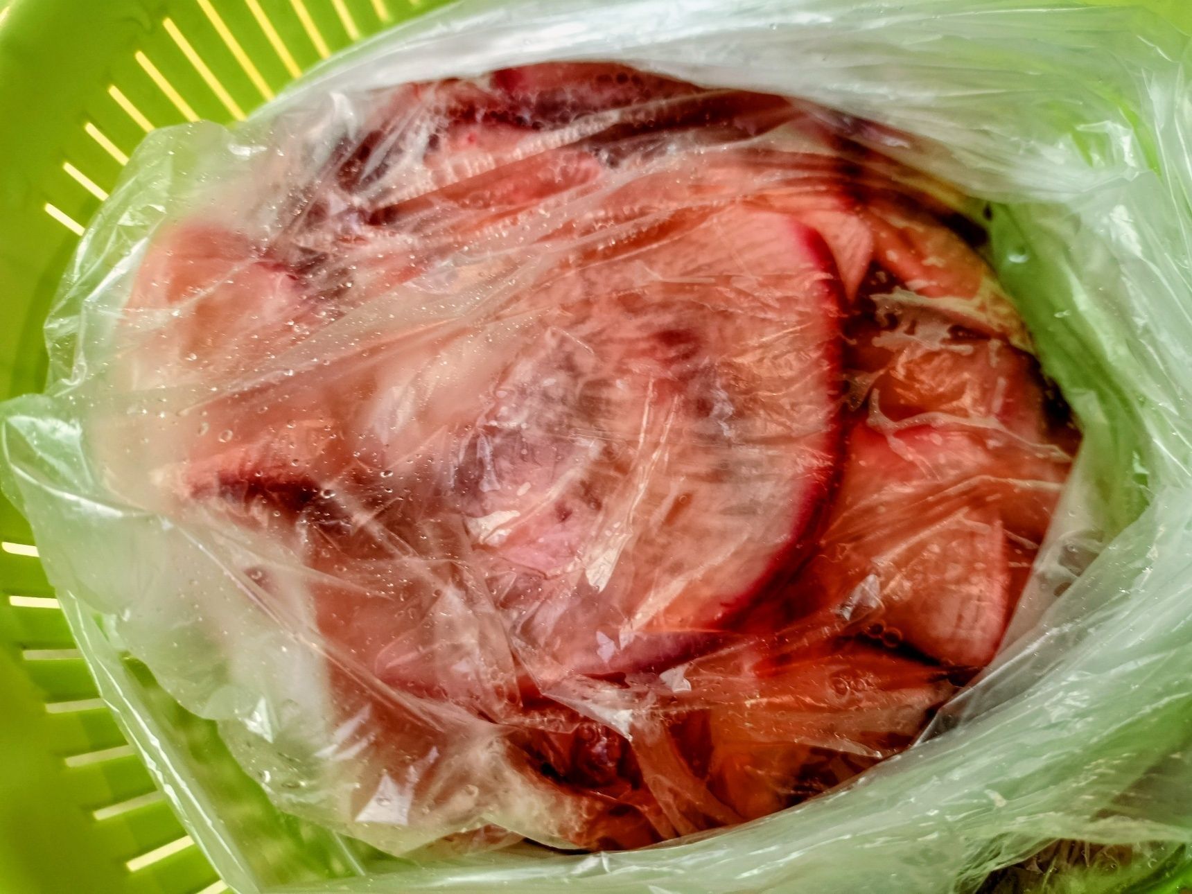 2. ビニール袋に入れて、合わせ酢を注ぎ入れる→袋の口を結び、冷蔵庫で1日漬け込む