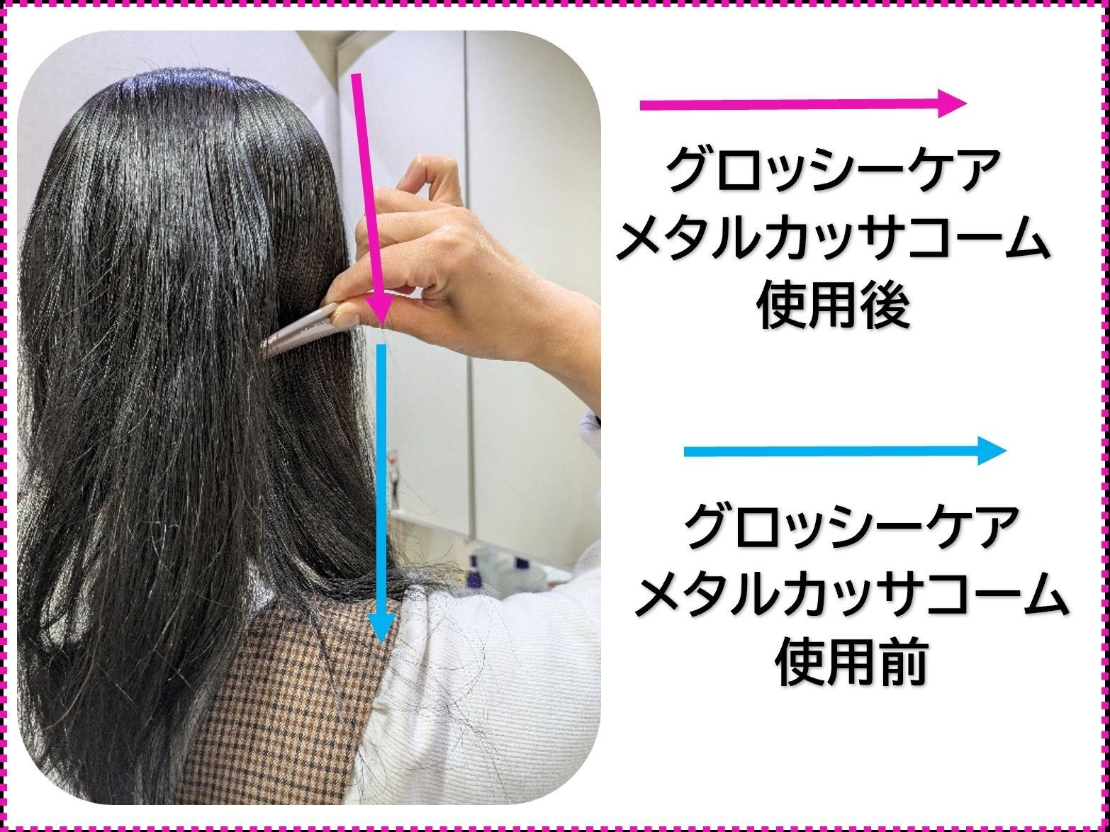 グロッシーケア メタルカッサコームで髪をとかしてから、
