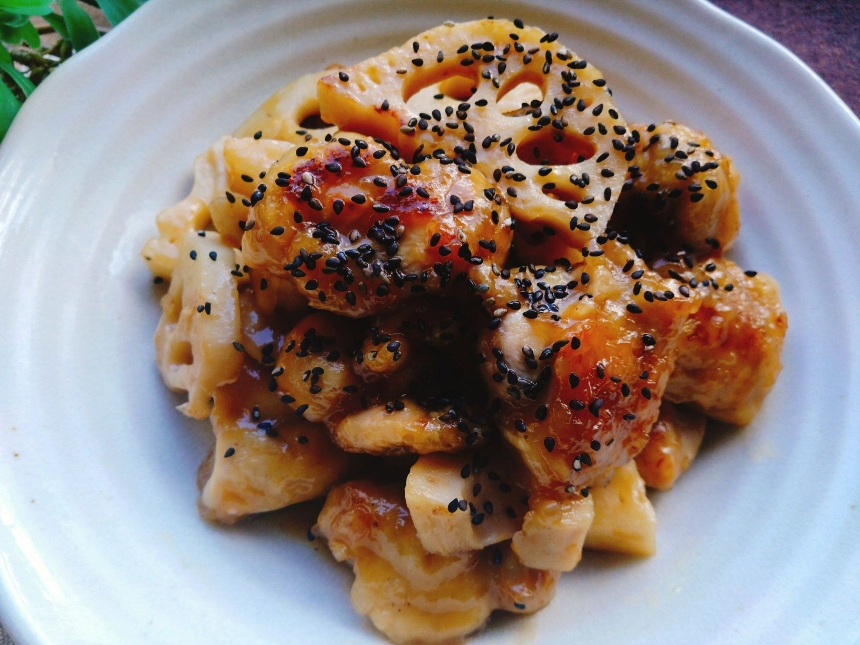 2.鶏肉に片栗粉をまぶし、余分な粉を落としてこんがりと焼く。余分な油をふき取り、れんこんを戻したらBを加えて全体に絡めながら、よく炒める。黒ごまを加えざっと混ぜたら完成