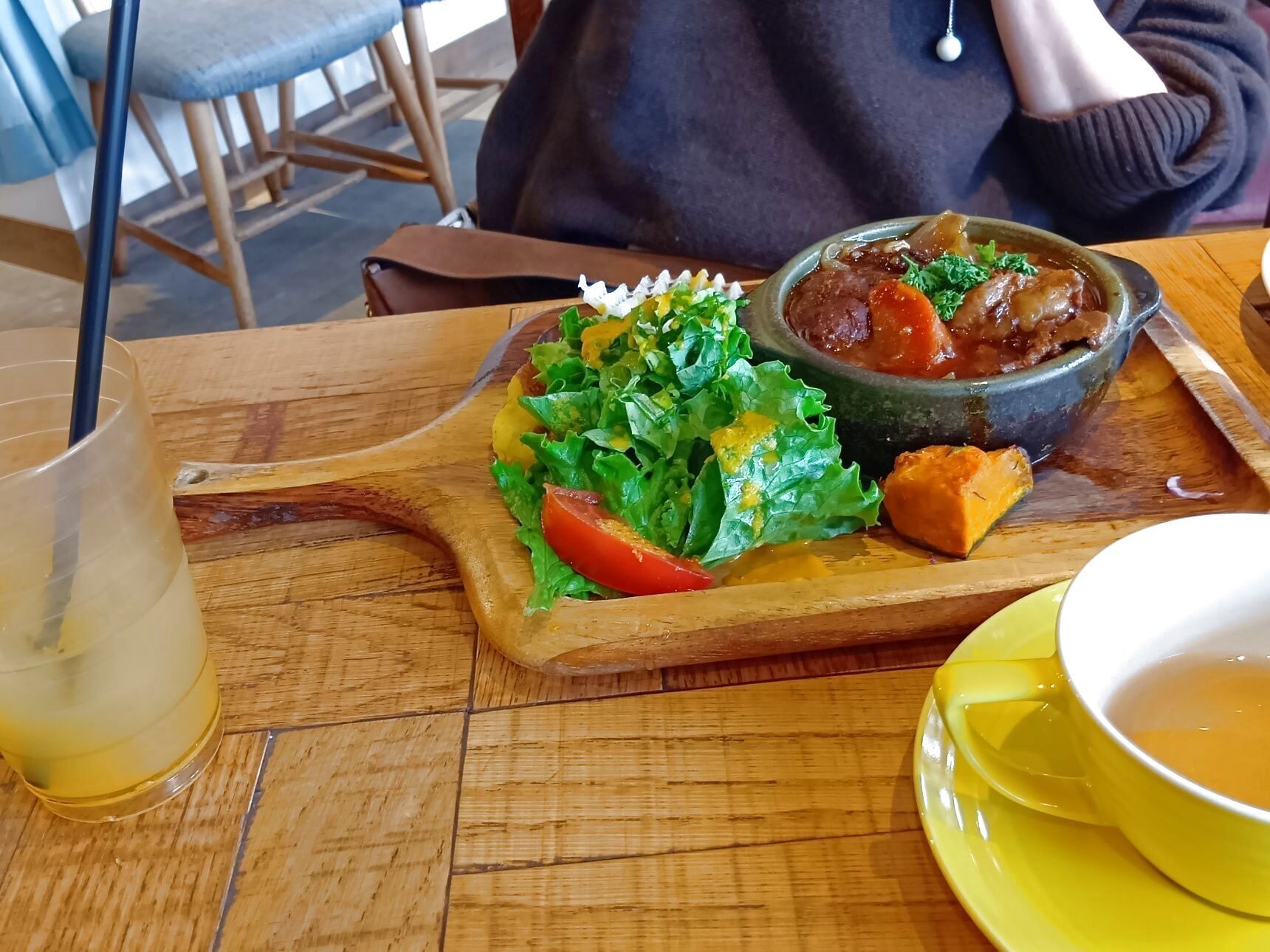 私は、ランチセットの牛肉100%のハンバーグをチョイス!お連れは、玉ねぎの旨味たっぷり牛すじ煮込み。
