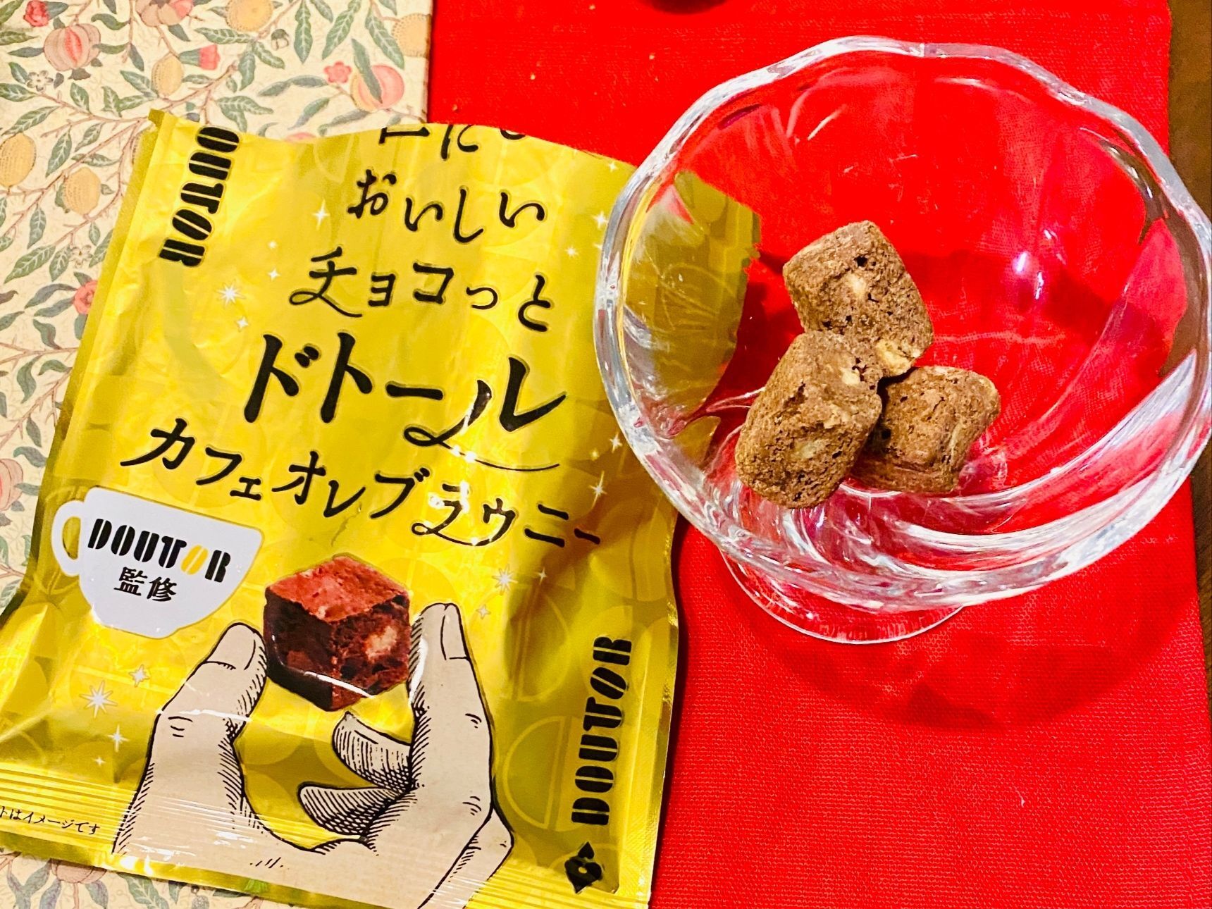 ドトールのこだわりの深煎りコーヒーを使用した生地にホワイトチョコをサンドし、さらにカフェオレ風味の一口サイズにカットしたブラウニーが入っています。