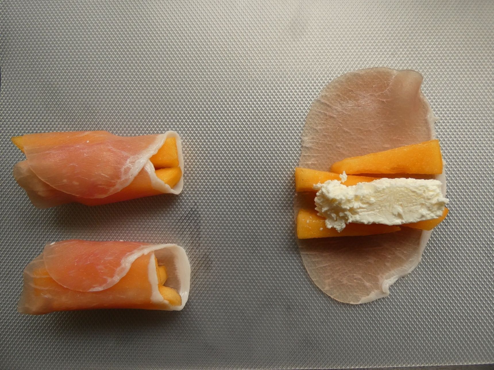 生ハムの上に柿とクリームチーズを乗せ、巻いたら完成。