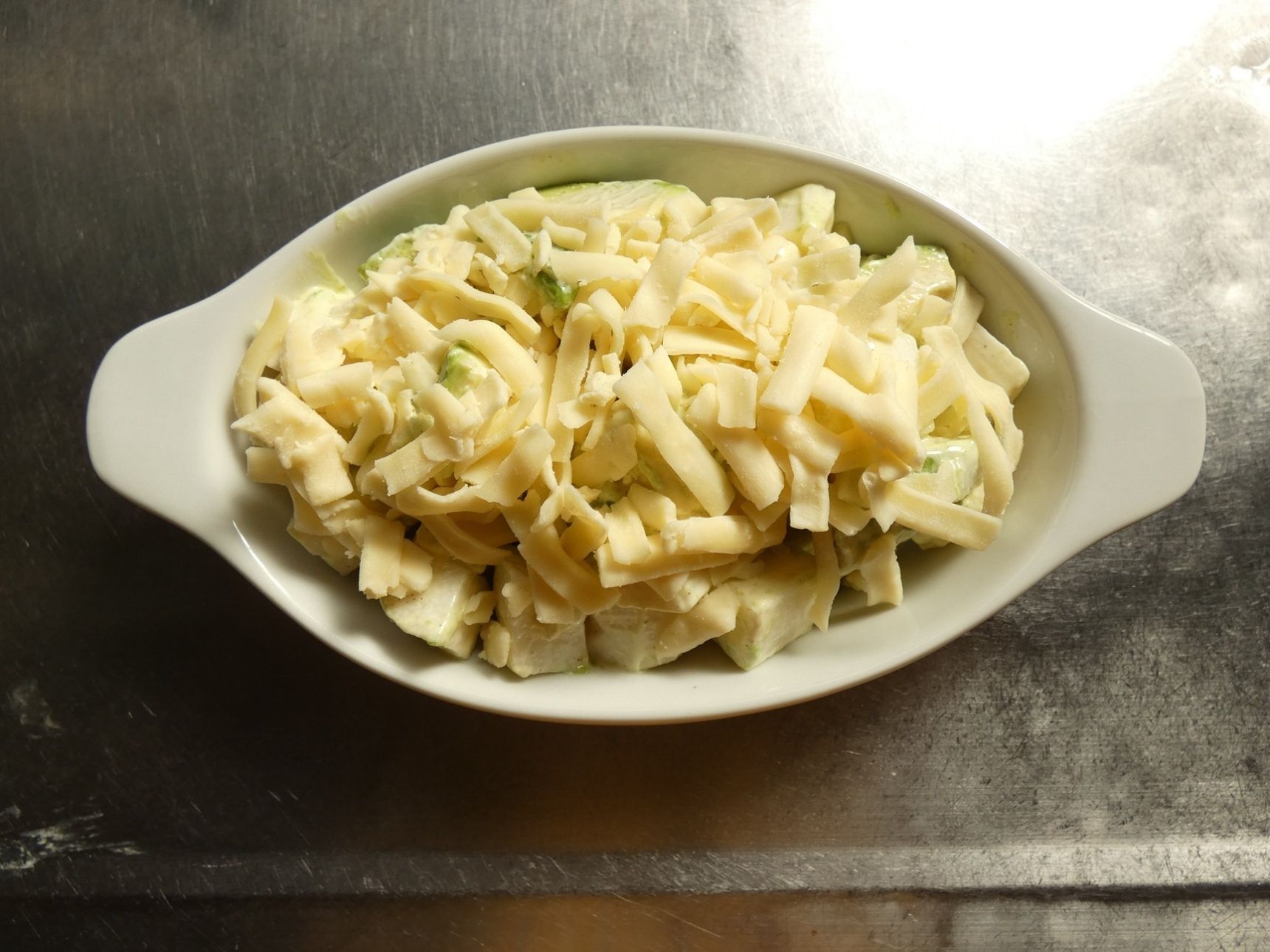 耐熱皿に入れてピザ用チーズを乗せ、トースターで焼きます。チーズが溶けてきつね色になったら完成。