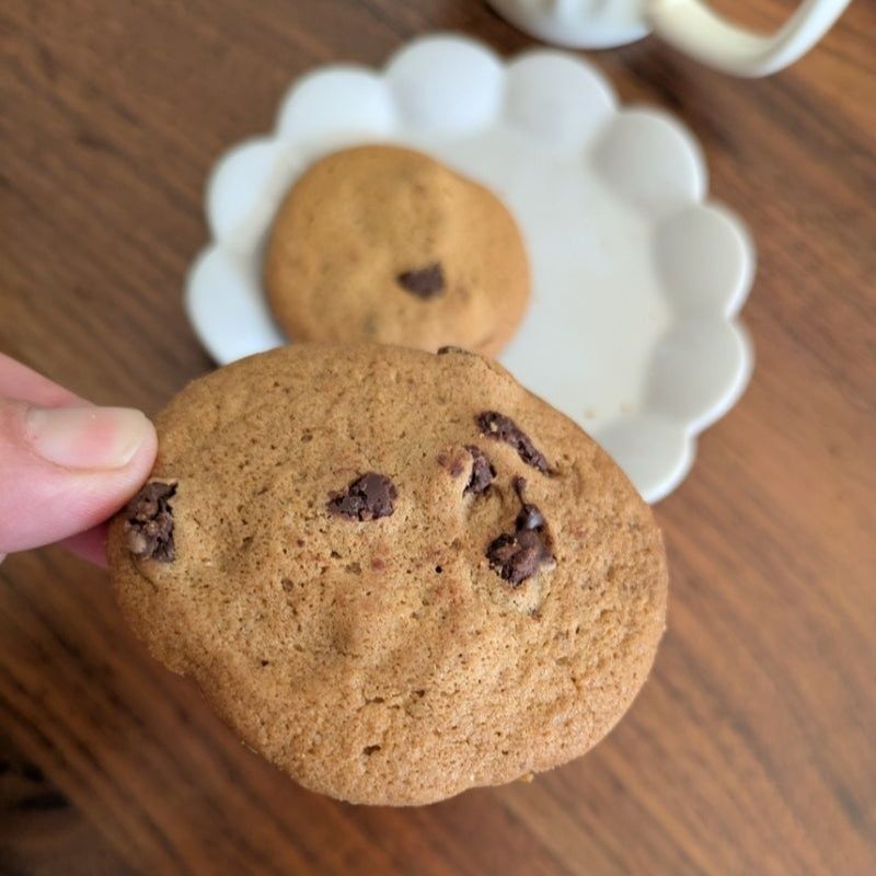 手作りクッキーのような、1枚づつ形が若干違う。生地は、薄くてサクサクで軽いけどチョコチップたっぷり!!少し塩味も感じてものすごく美味しかったです。