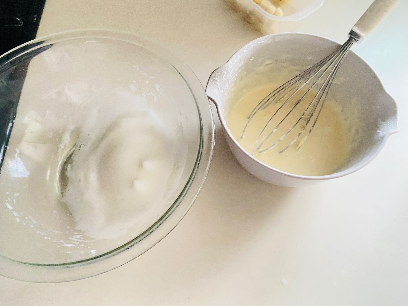 ⑤卵黄を別のボウルに入れてよく混ぜ、砂糖を加え混ぜます。