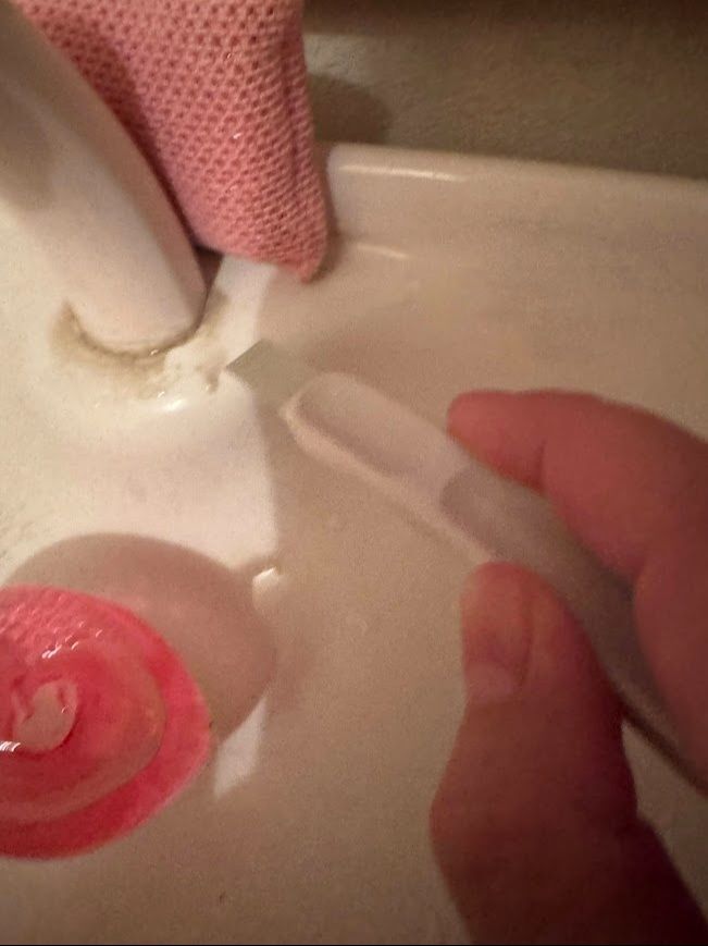 使用方法は簡単です。水に濡らして汚れを擦るだけです。面白いようにカリカリ汚れが落ちました。先端樹脂は薄く幅も小さいので、汚れがたまりやすいキワや隅の汚れ落としに最適でした。
