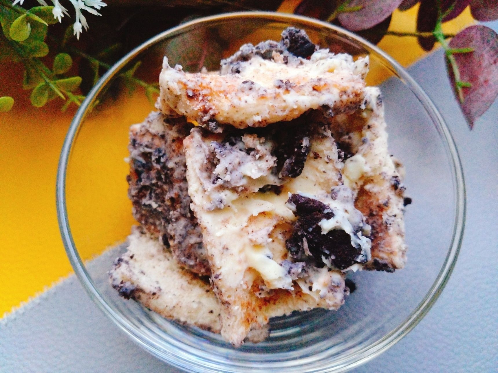 2.ボウルにパン、オレオ、チョコを入れて全体をヘラで混ぜる
