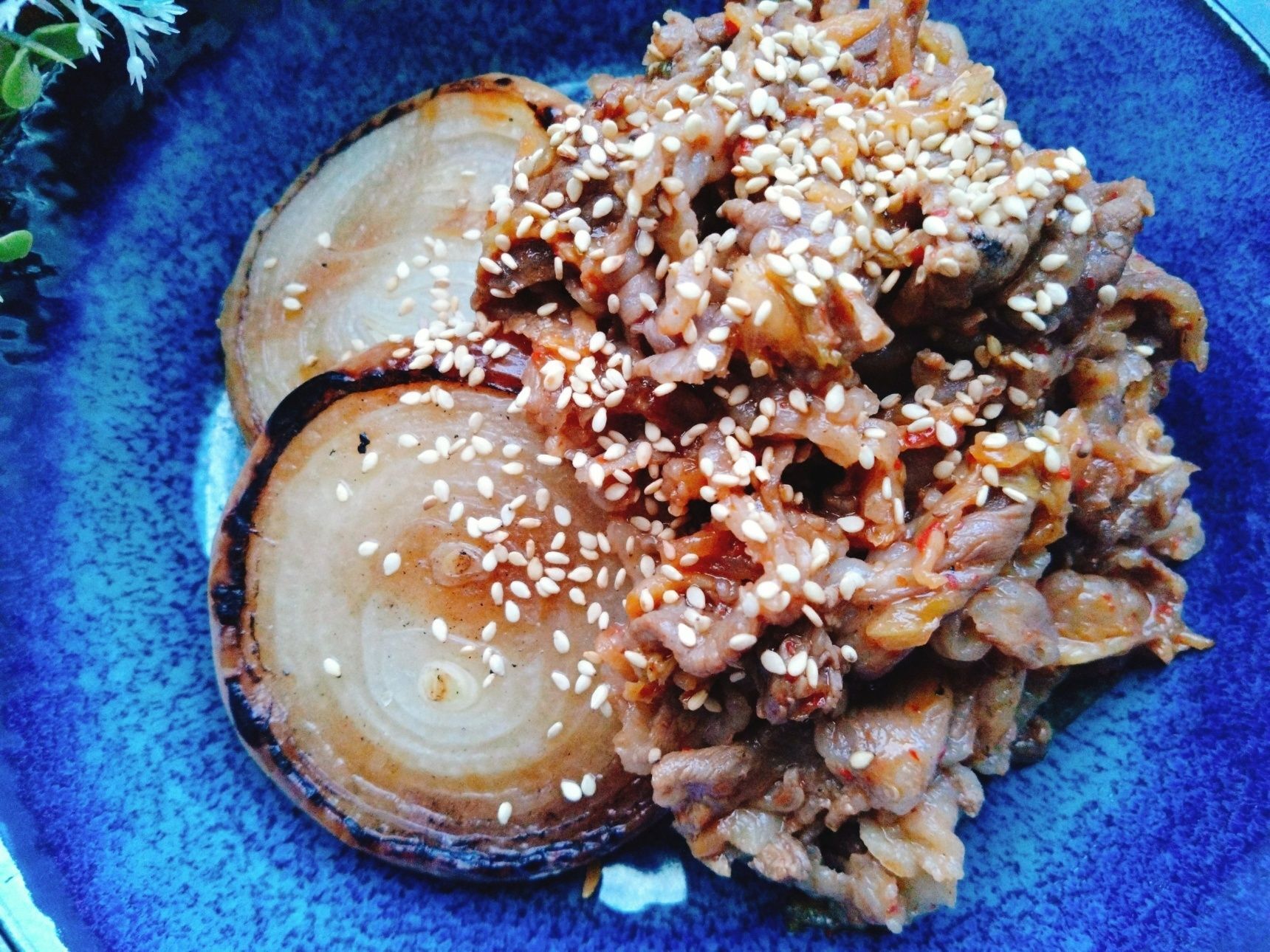 お好みで青ネギ、白ごまをトッピングして。玉ねぎを崩しながら牛肉と一緒にいただきます。甘さの増した玉ねぎがたまらなく美味しい1品です。
