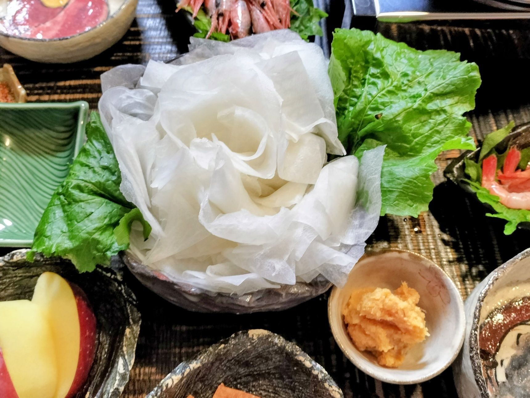 3.大根を10cm程の長さに切る→皮を剥く→スライサーで、繊維に沿って4〜5cmの幅に切る→器に盛り付ける