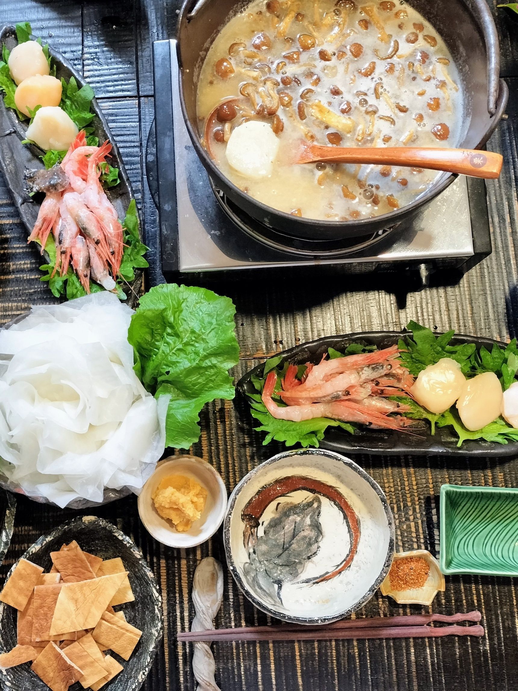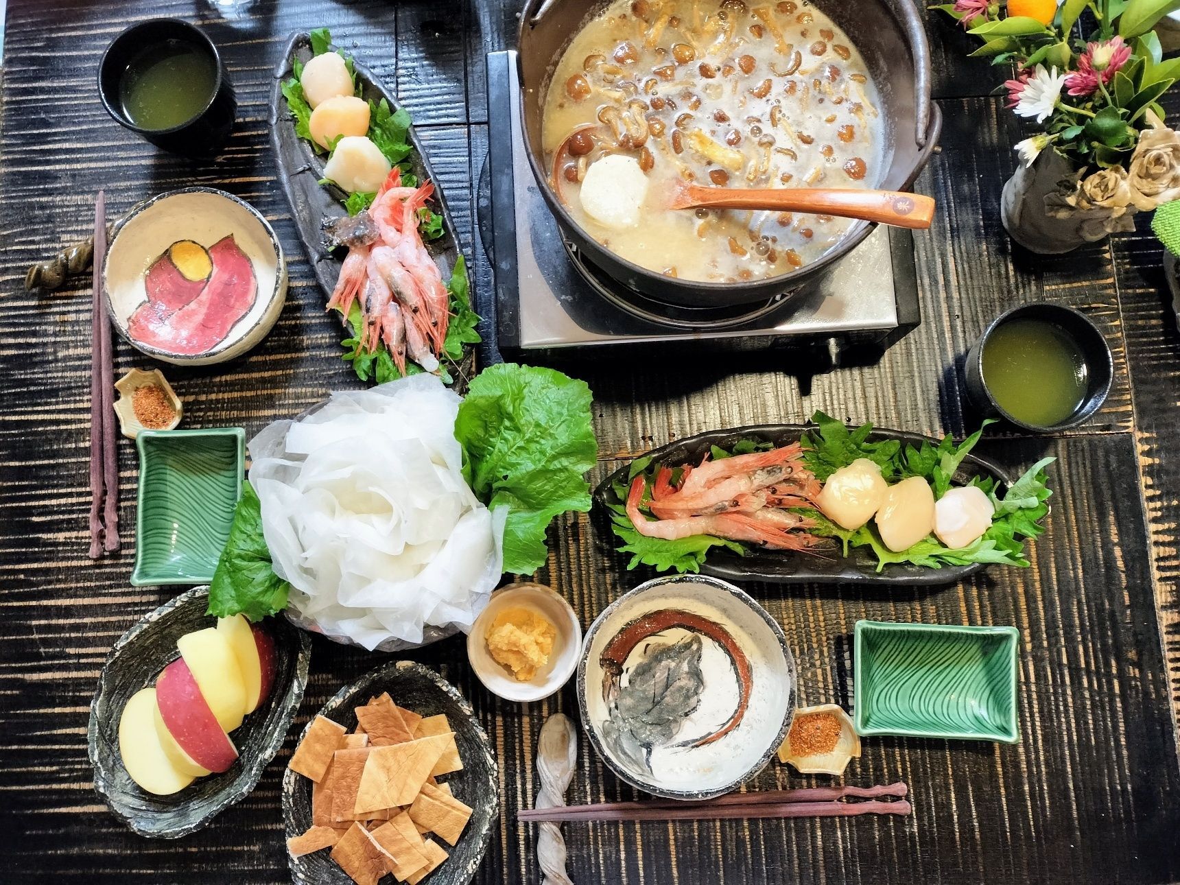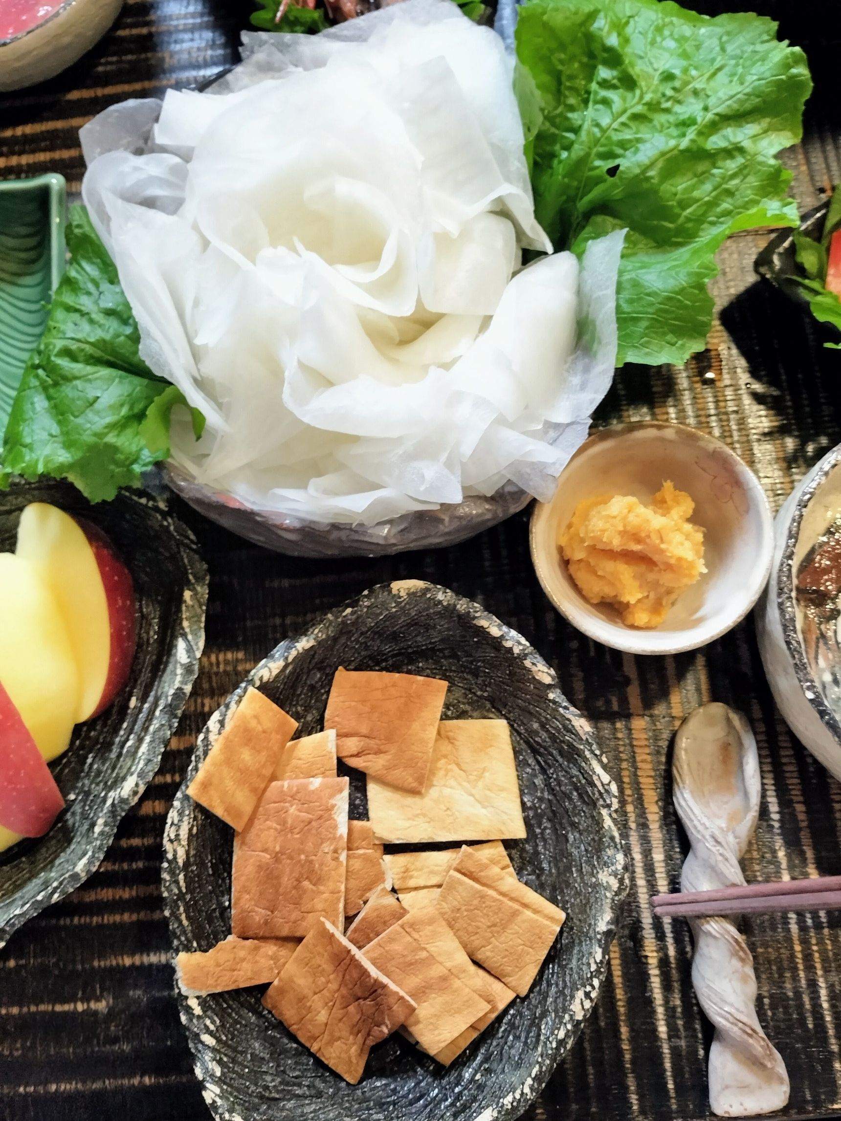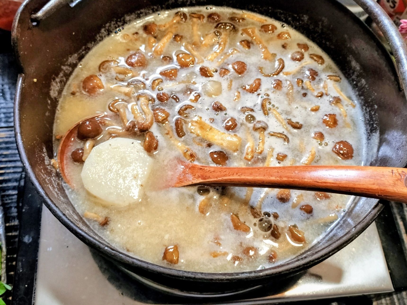 なめこや煮干しのだしの効いた美味しい味噌鍋を温めながら、都度、大根や焼き麩を入れて火を通し、いただきまーす!