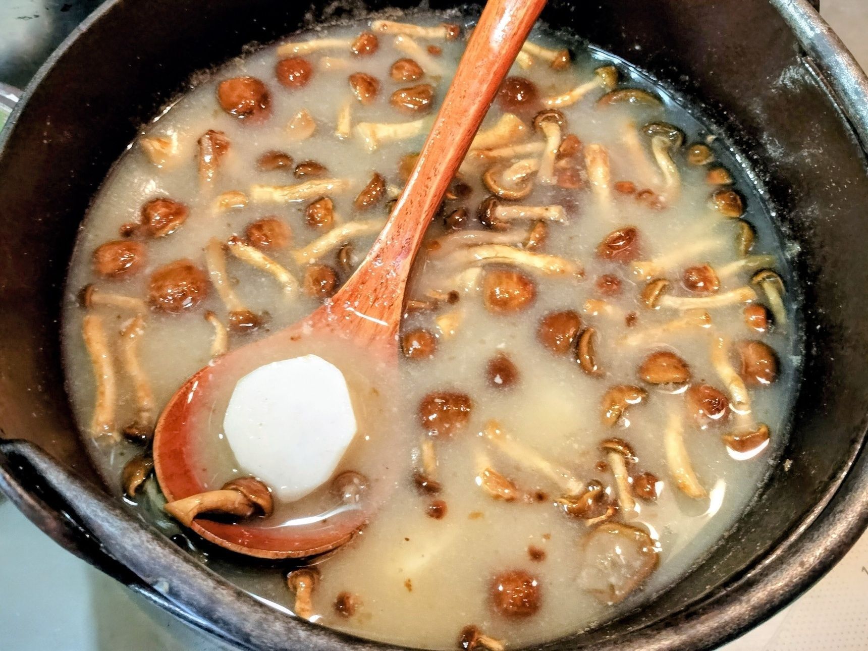 5.手順2の鍋に、なめこを加えて、5分程煮る→フンドーキン合わせ味噌を加えて溶かす→さらに、5分程煮る→鉄鍋のまま、卓上ヒーターにのせる