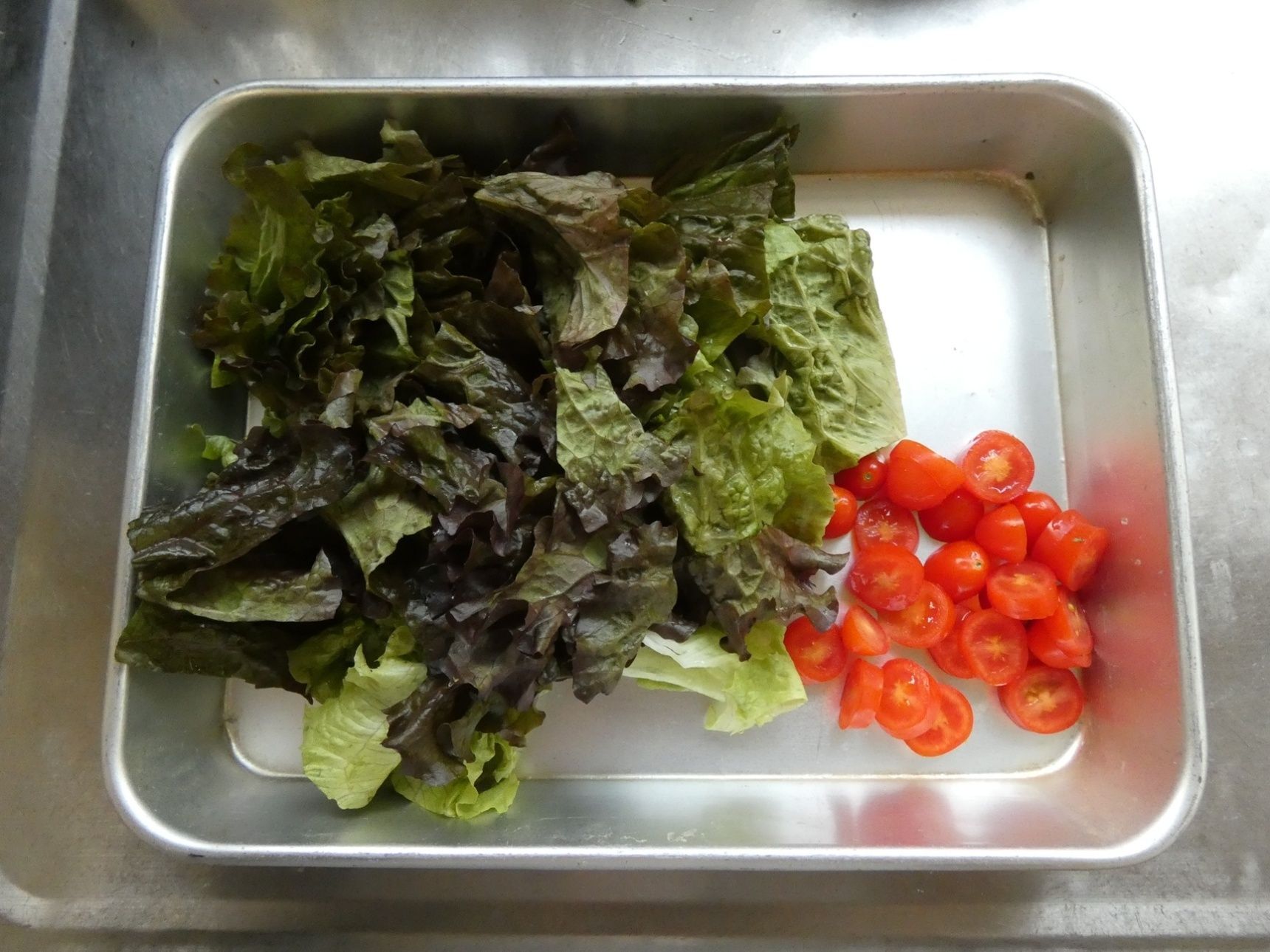 サニーレタスは食べやすい大きさに切り、ミニトマトは半分に切ります。