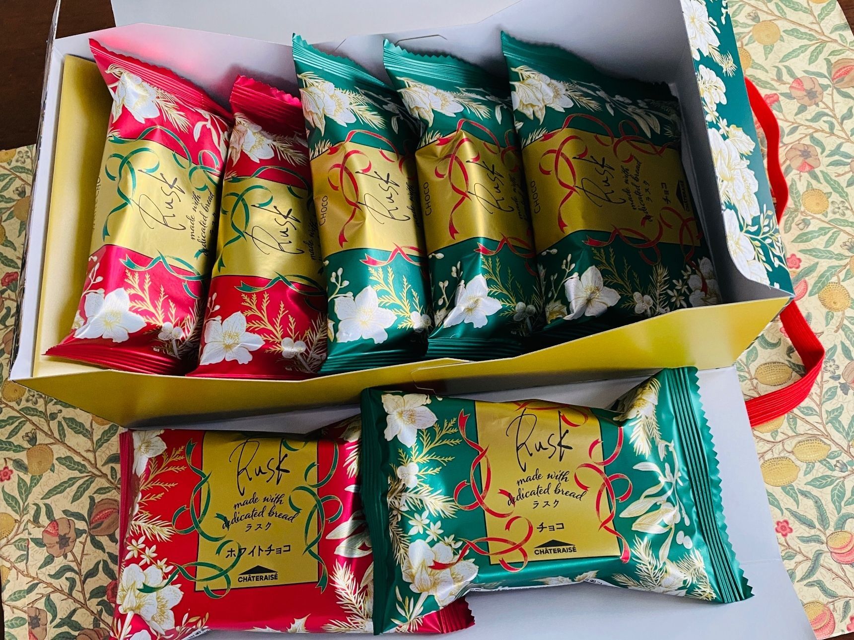 Xmasホワイトチョコラスクは3袋入りで、1袋2枚入っています。