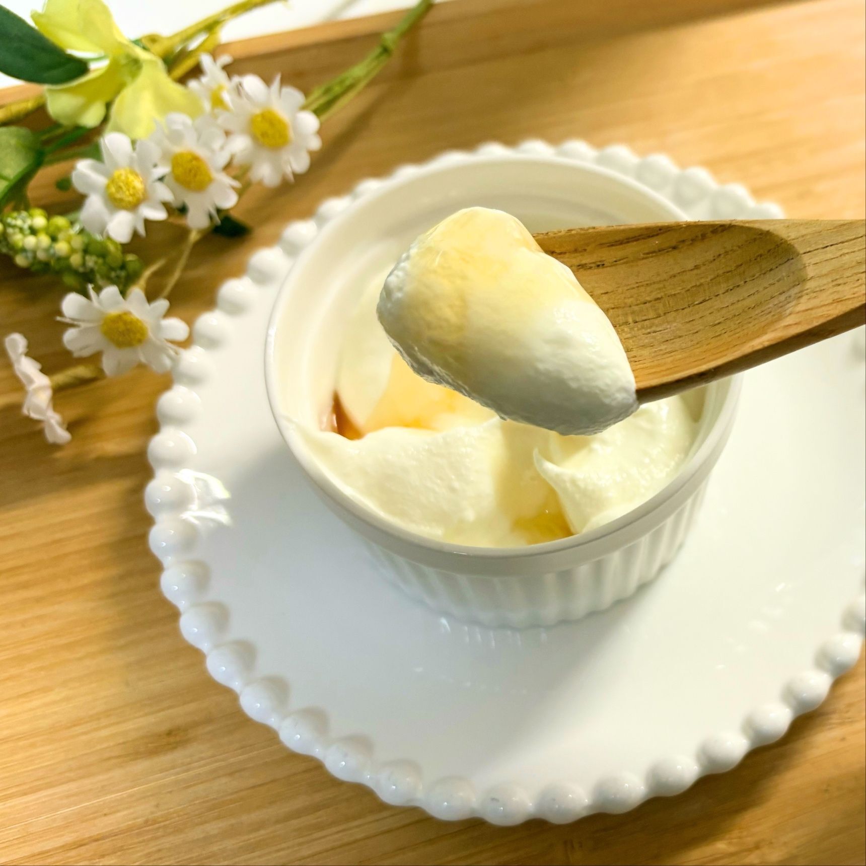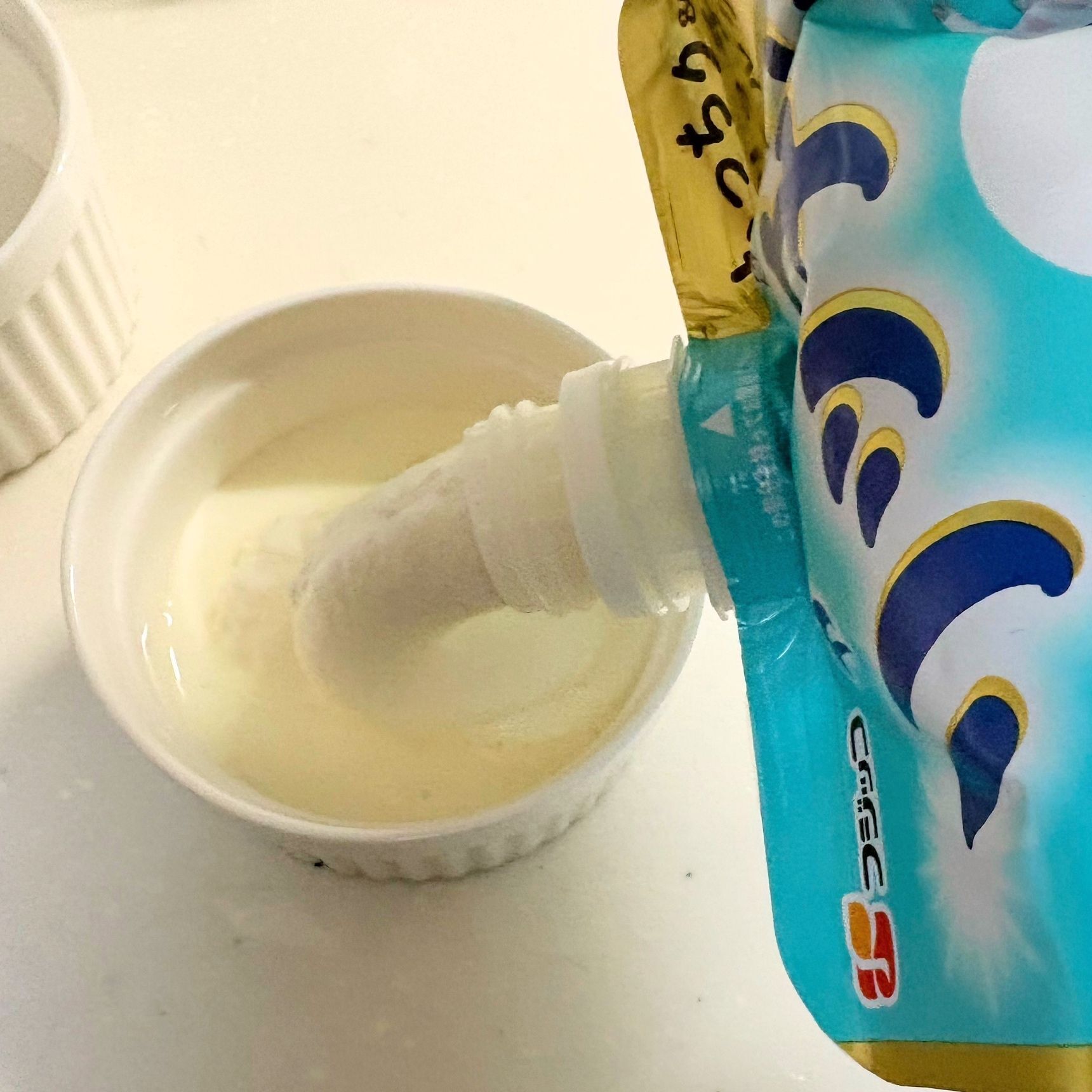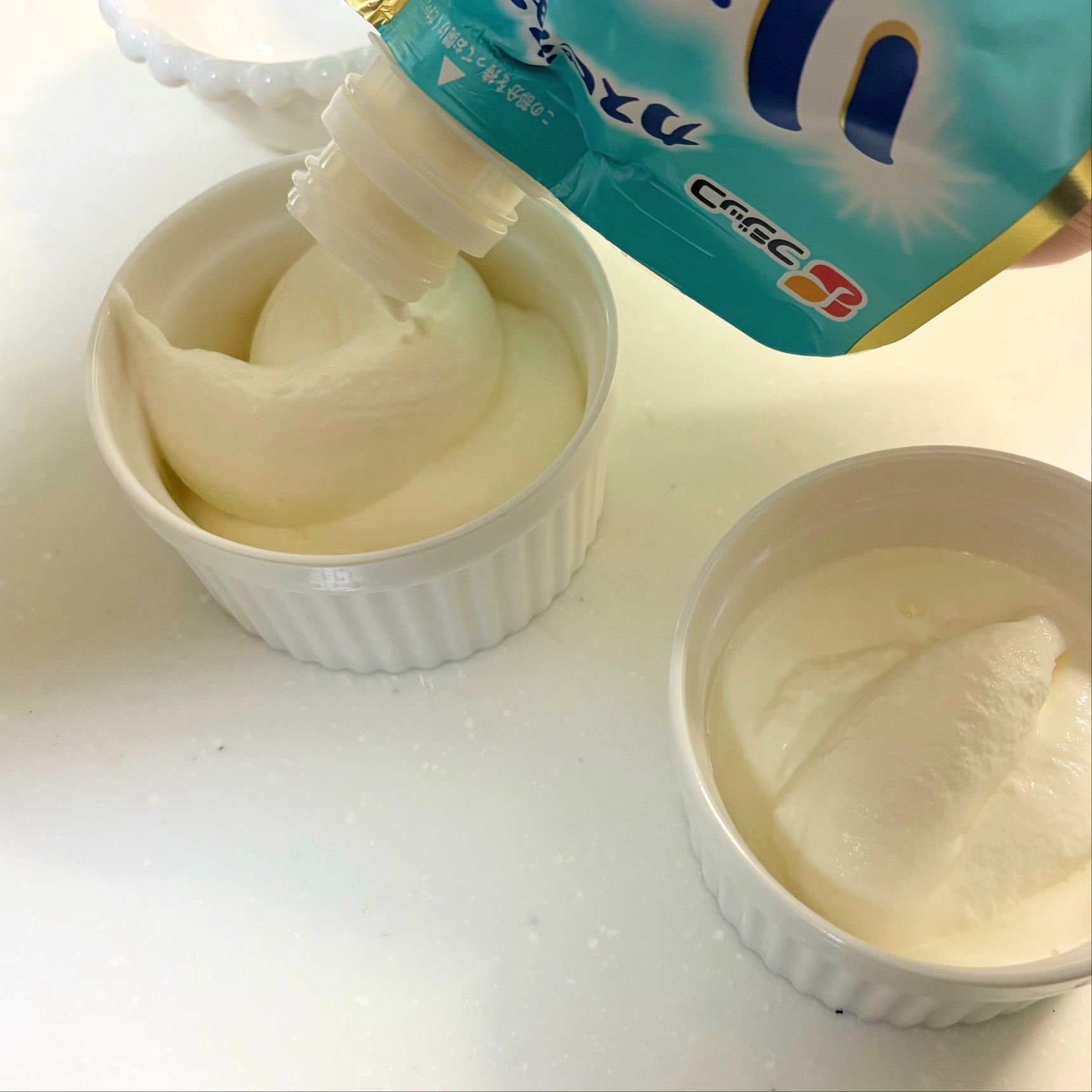 一般的にヨーグルトに比べて固めなので、器のピンポイントに出すことができます。